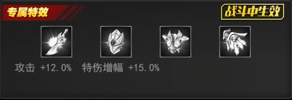 +15能量技 凤凰冲击波[特技]对敌方全体造成450%的伤害,使目标所有防御减少10%,持续2回合;额外使目标受伤率增加15%,持续15回合