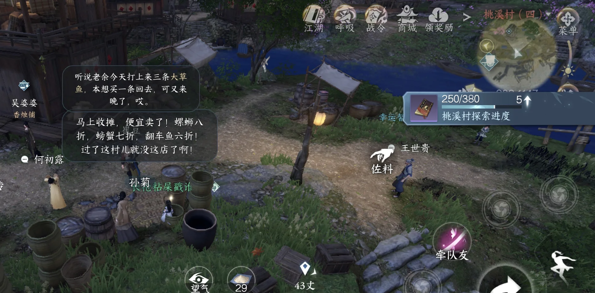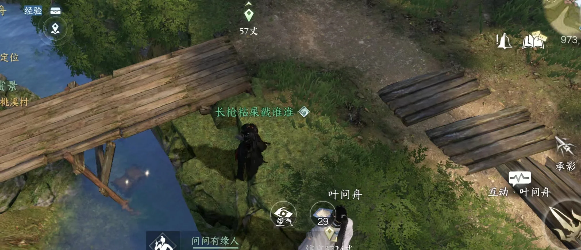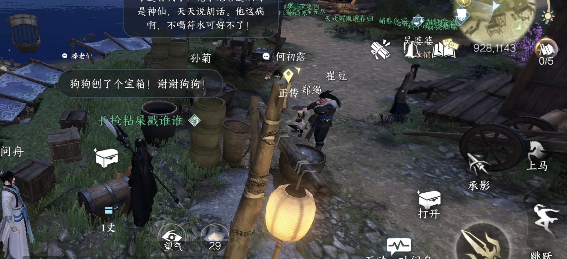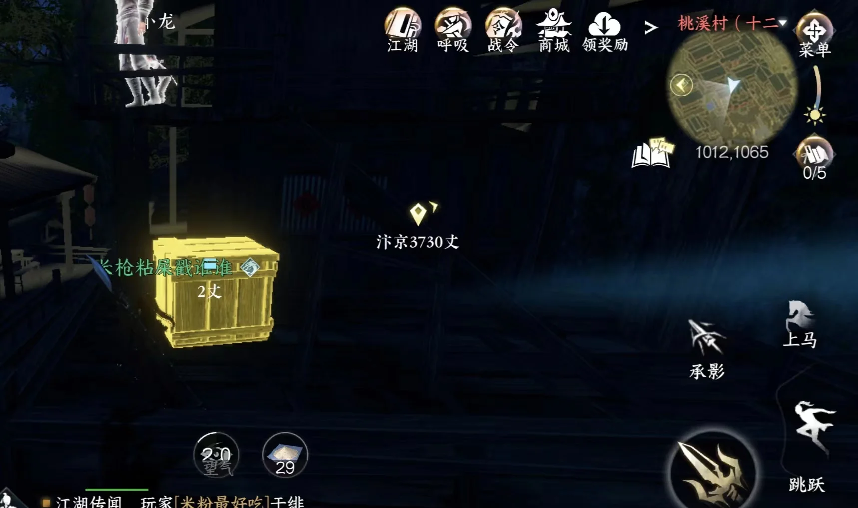 1:桃溪村码头坐标:929.114,使用【望气】可以看到发光的木箱,打碎它了可以获得宝箱。
