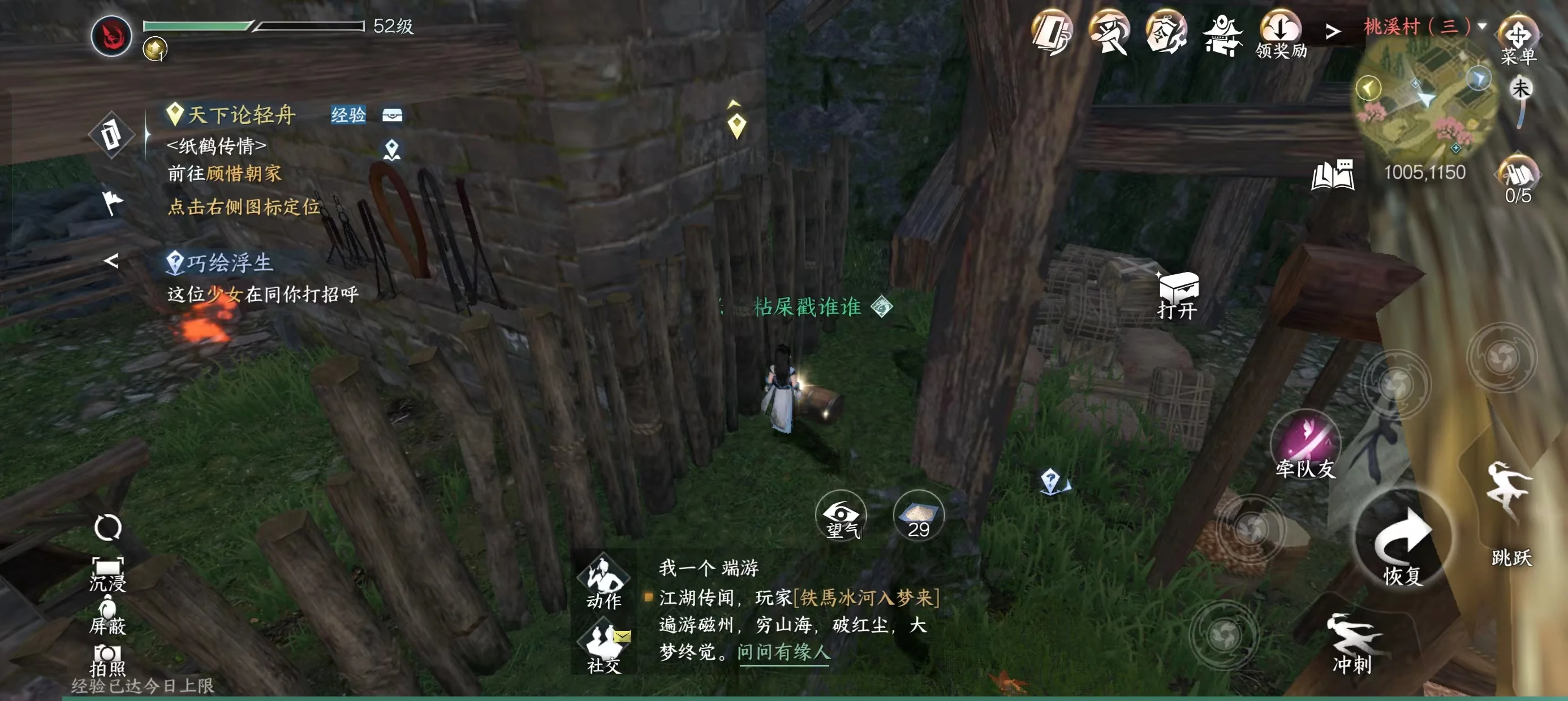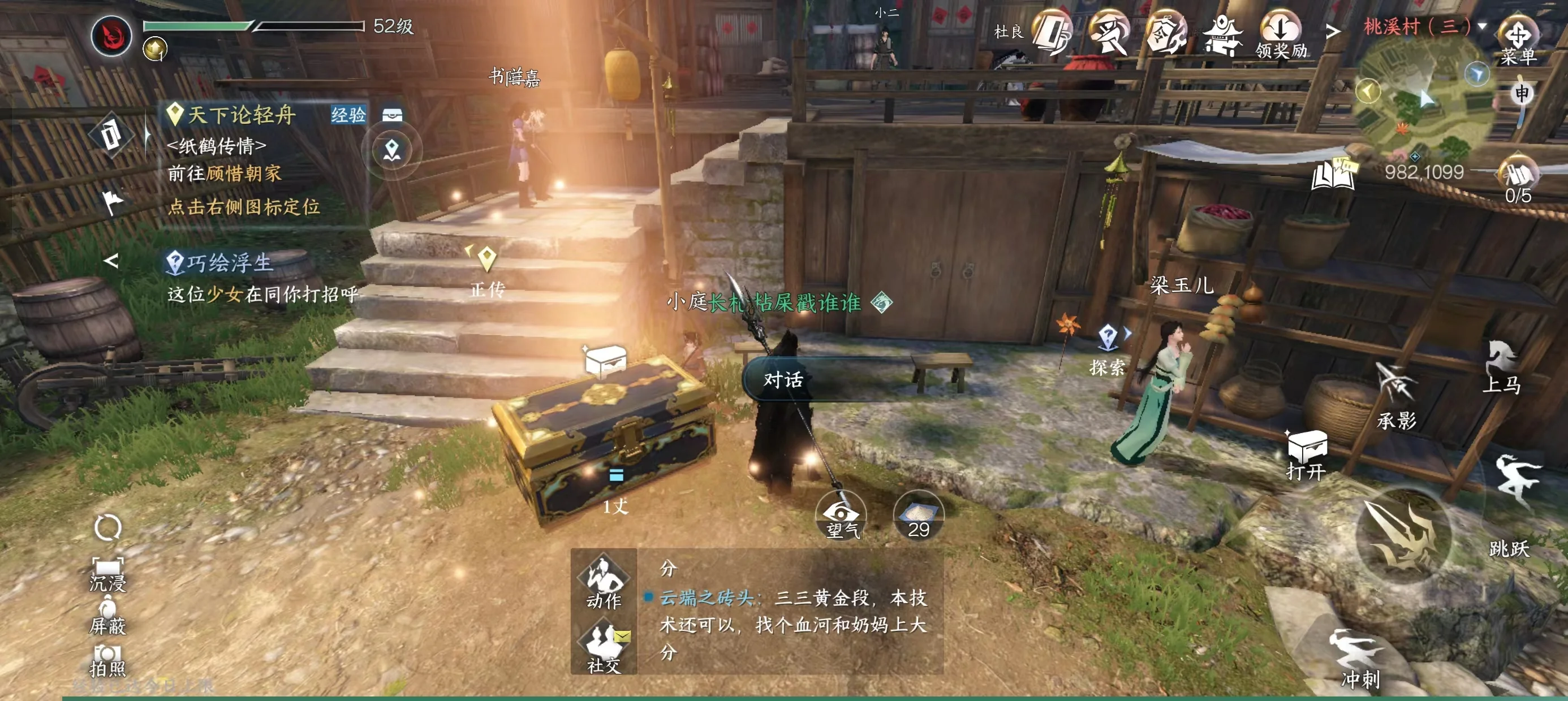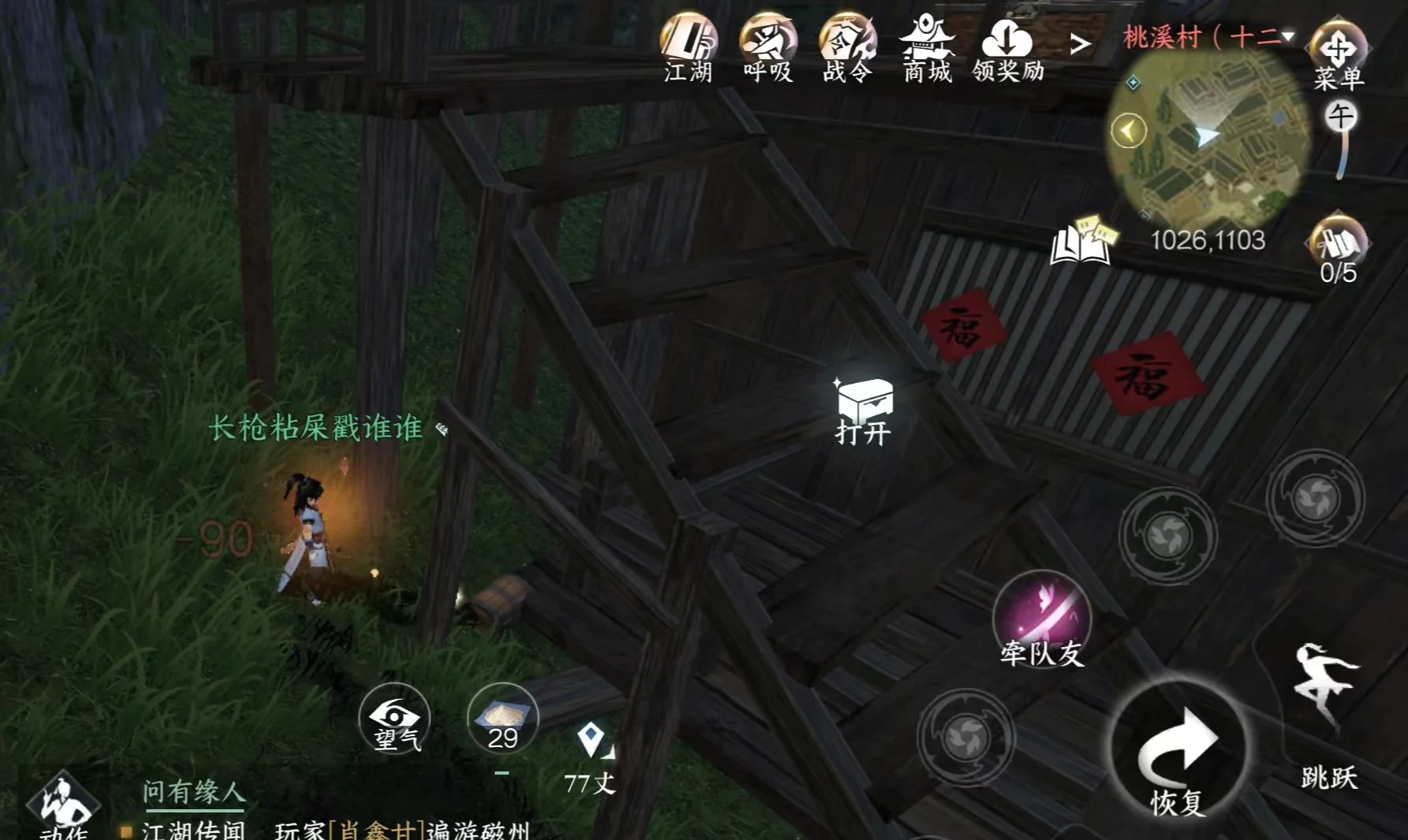 桃溪村里最高的屋顶旁边有三个npc【小天 大黄 山山】坐标是1027.1072。使用【望气】可以发现旁边屋子有一个宝箱,屋外旁边也有个宝箱。
