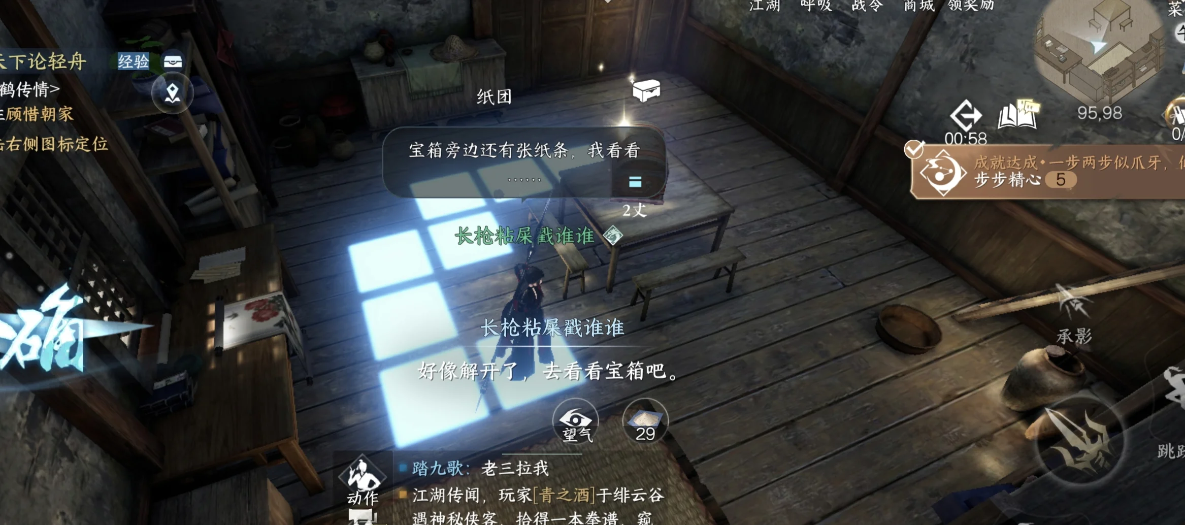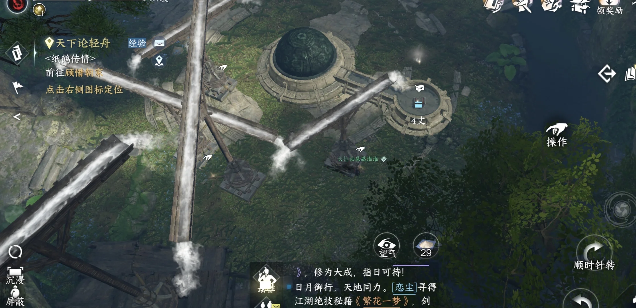 在npc【顾教头】旁边有颗大树使用【望气】可以看到小风车。点击小风车人物会变小。然后就可以找到宝箱。