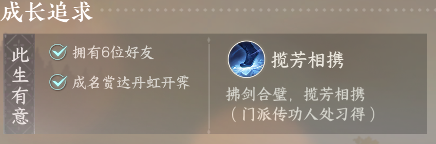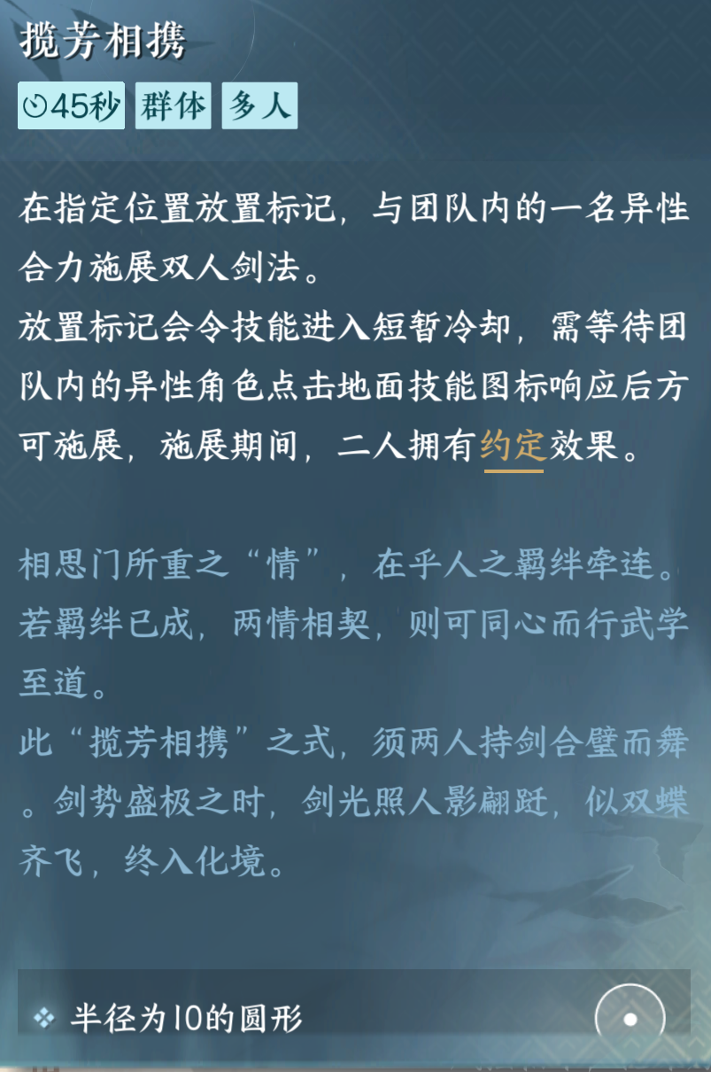 另外就是揽芳相携这个技能,学习的条件有些苛刻,需要两人共同释放就算了,还需要和六名好友以及达成丹虹开霁成就才能学习,但这个技能还是很强的,范围大是一方面,另外一方面就是它是群伤,在PVP中前期也是个小神技的存在。