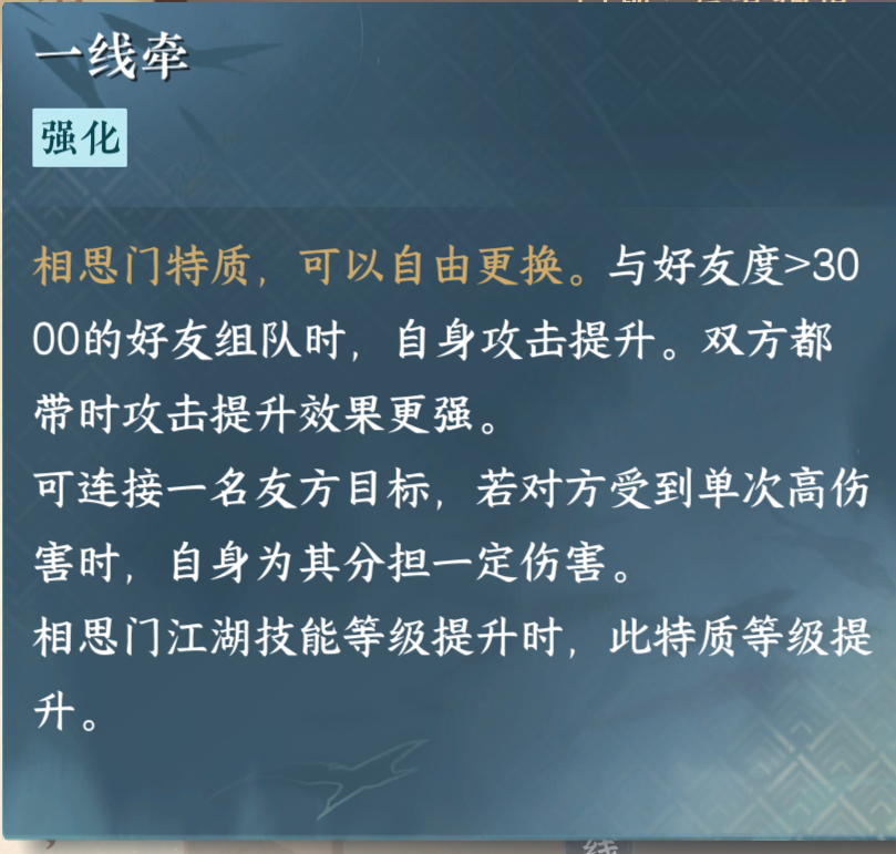 还有就是一线牵这个技能,这个技能需要额外的舞蹈等级到六级才能学习,但需要和3000以上的好友度的好友组队才能生效,更重要的是这个技能真的很强!和同样拥有这个技能的老哥组队的时候,能够提高120%的攻击,强的一笔!