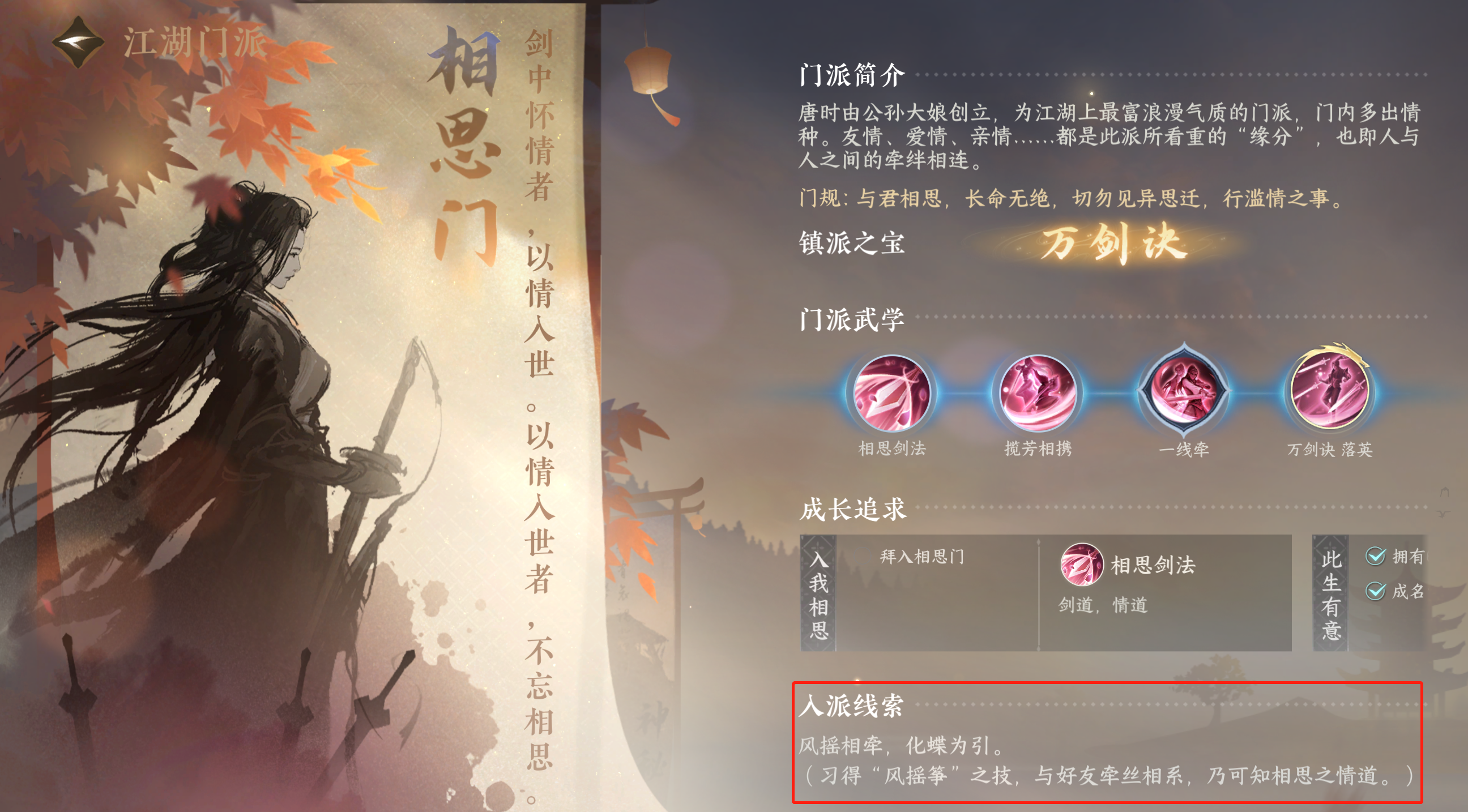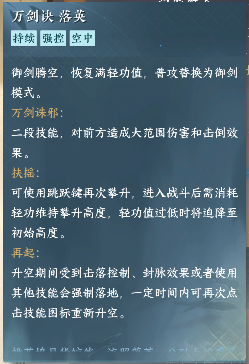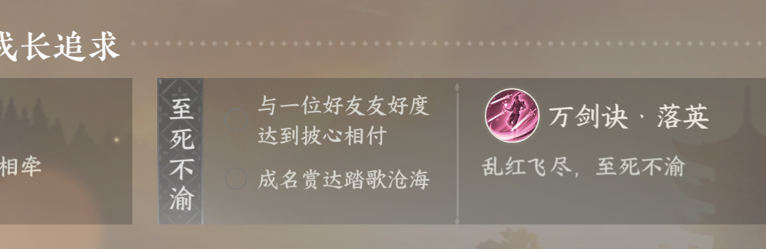 最后就是万剑诀落英,需要和一个好友达成彼心相付和名赏踏歌沧海,这个技能可以说是非常强的技能,也是这个门派的核心技能,能打,能跑,还能控,可以说是这个门派最强的技能也不为过。