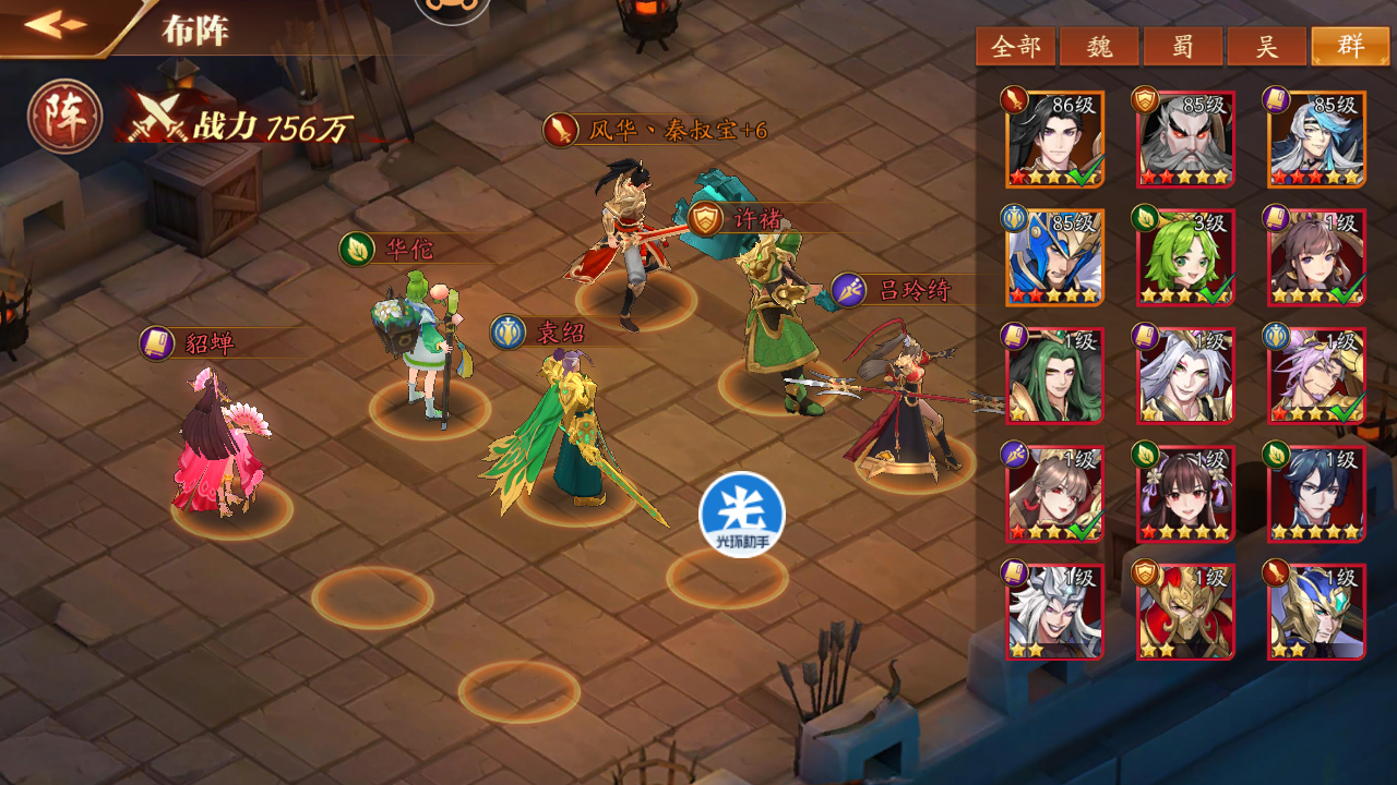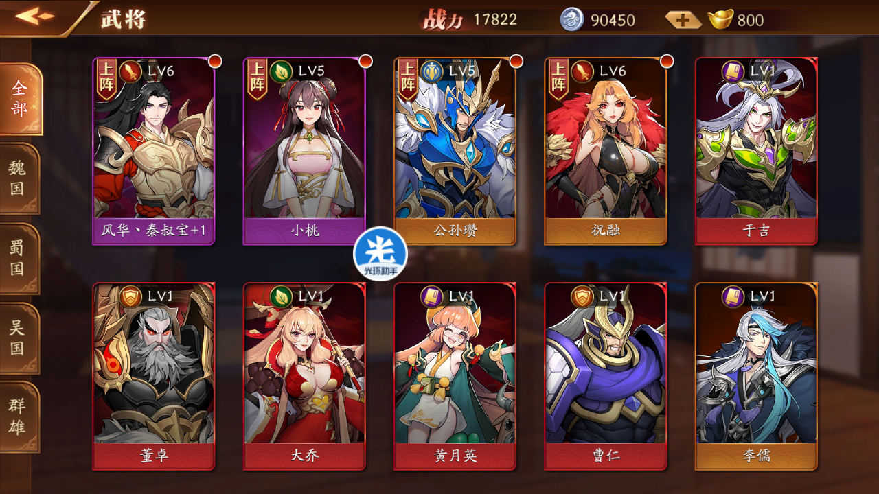 这时候就可以全部本国红将上阵了,因为主要任务是过副本,所以要考虑群攻多、PVE强的武将。