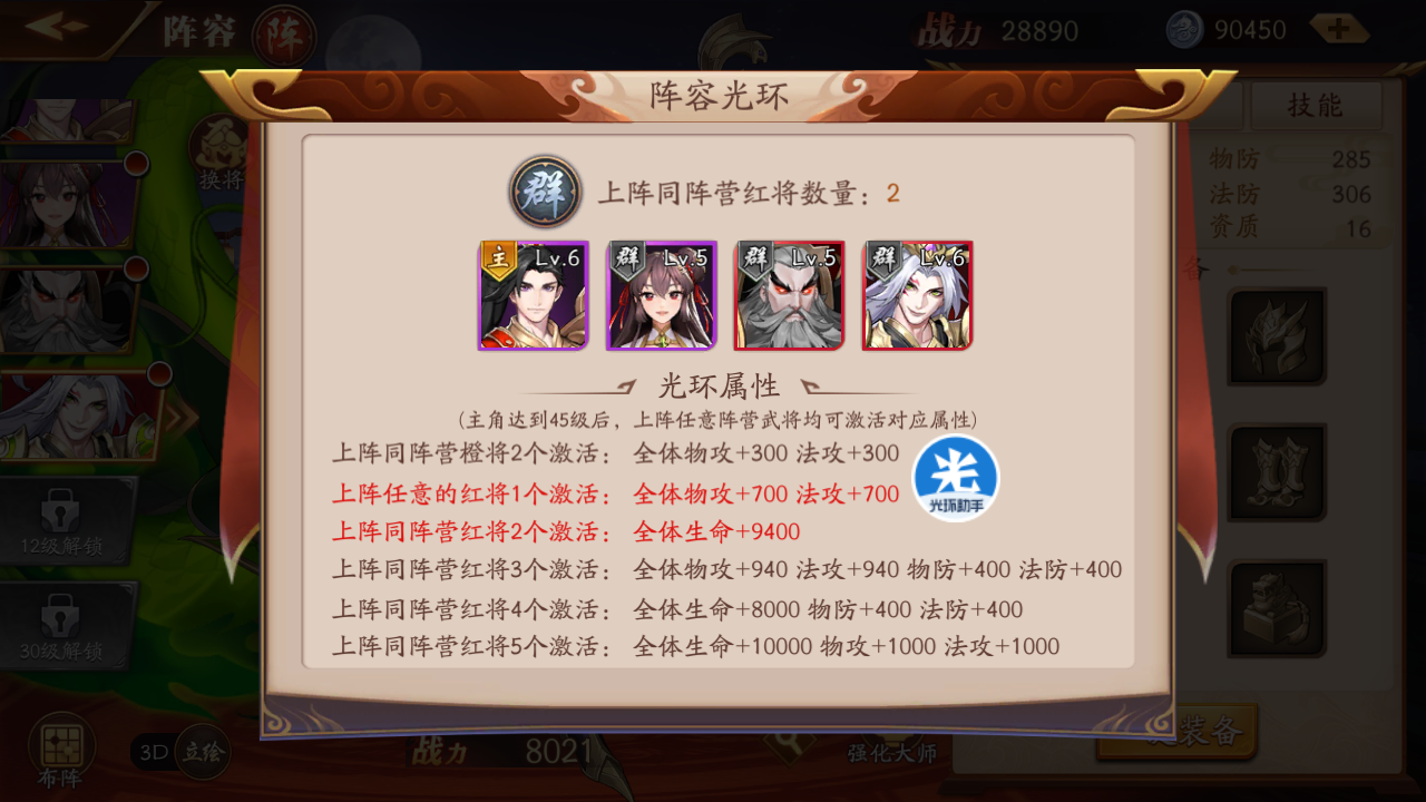 主角到了45级,只要上阵6个任意红将就可以解锁阵容光环,不再需要本国武将了。这就为混搭提供了可能。