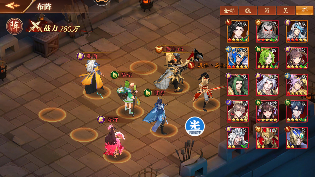 比如:如下图,我走群雄的话,就上主角、于吉、董卓,再搭个小桃、公孙瓒。