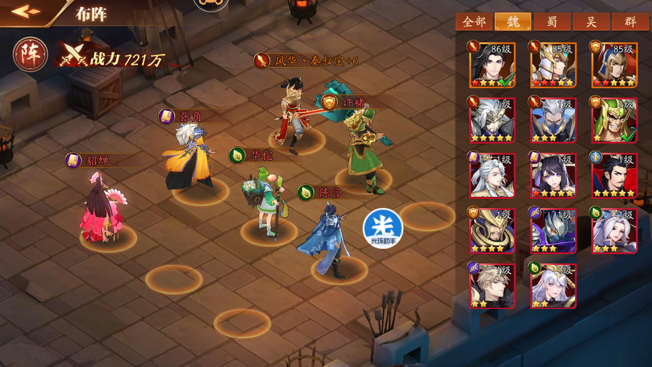 主角到了30级即可上阵6个武将。这阶段是成型期,原则是上本国高星武将+功能武将。建队思路是,重点打造过副本阵营。