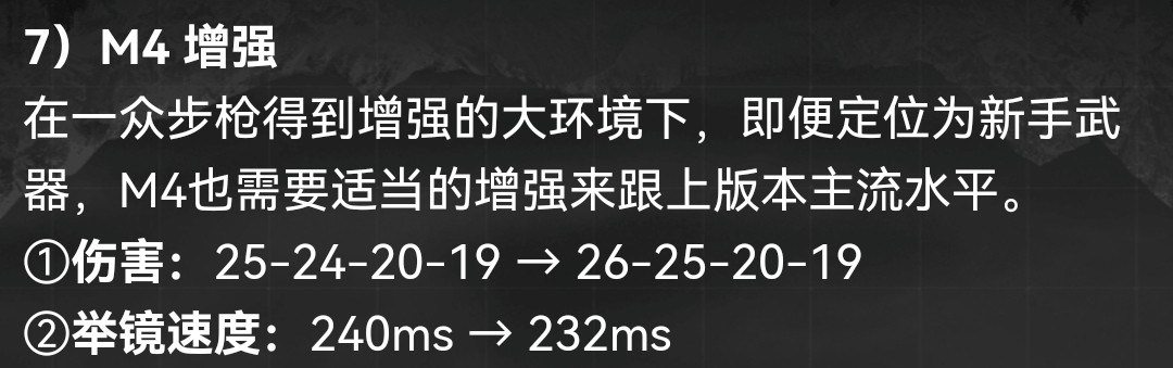 M4作为一把新手武器,虽然普通但不平凡,更是一度成为使命战场的神器。而由于皇家黑魂的加成在多人模式出场率并不低,但极低的爆发和不低的稳定TTK,导致即便有传说蓝图的加持上场率也依旧在降低。在“自由之舟”版本中,不仅提升伤害而且降低举镜时间,某种程度上来讲它又能上排位啦~