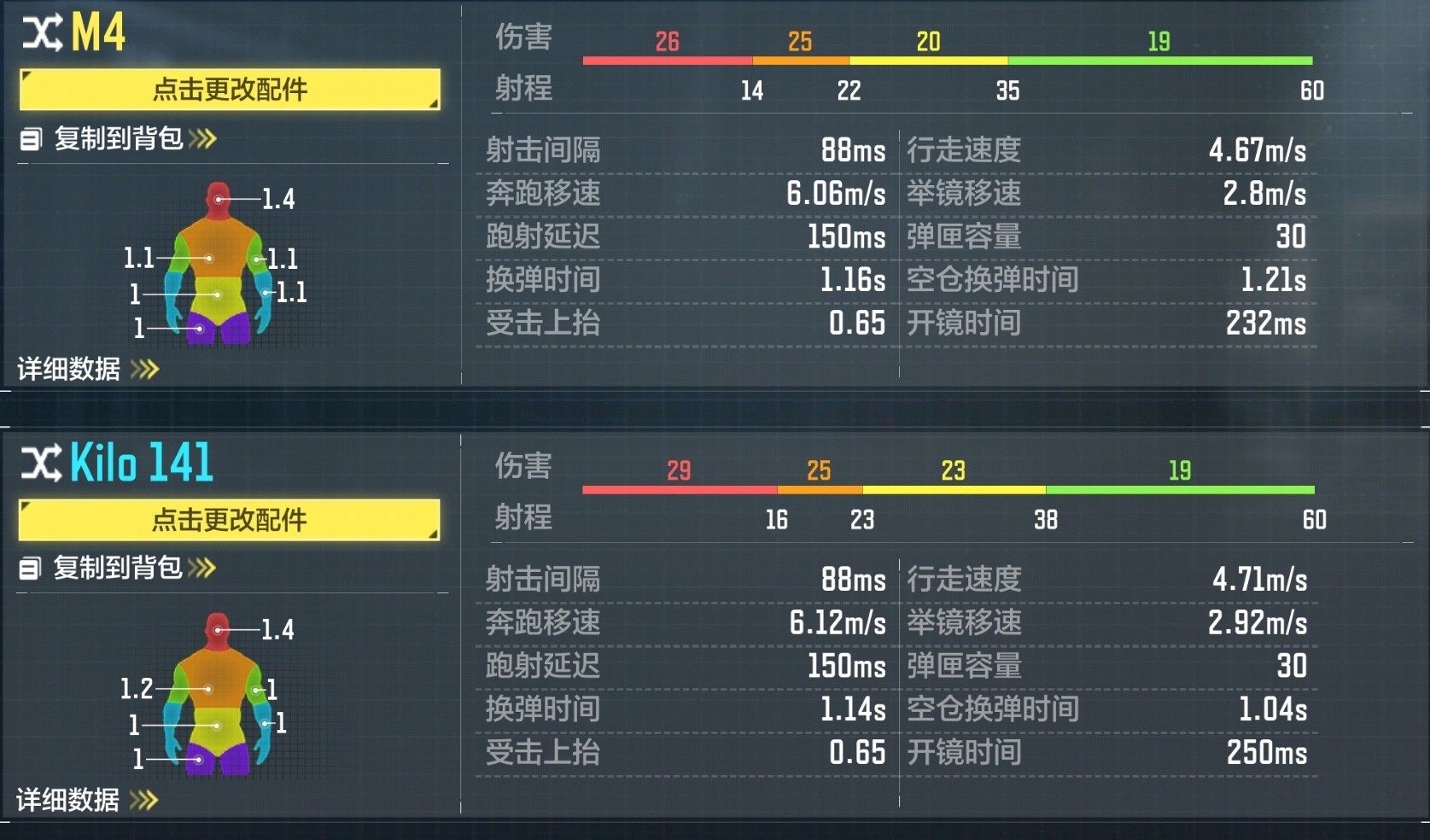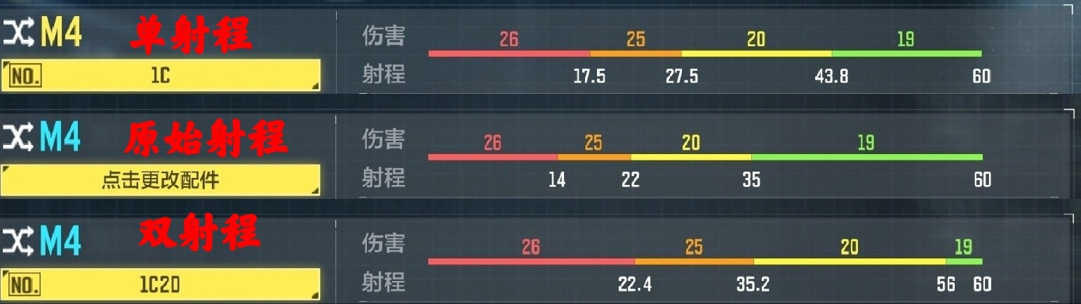 在当前版本中,M4依然拥有4段射程。第一段射程提升到26和之前一样全身稳定4枪倒,因此明中头部2枪+上半身1枪可以爆发带走,意义不大。而第二段伤害变为25也意味着全身4枪倒。而22M稳定4枪倒,同样射速的的还有一把枪,那就是Kilo141,2段稳定TTK=262ms,勉强可以到T1。2段射程之后衰减较大但也可以稳定5枪倒,甚至全射程也可以做到高爆发5枪倒,这也是战场好用的原因之一!因此M4在提高中距爆发后,只需略微提升射程即可打出中段优势!