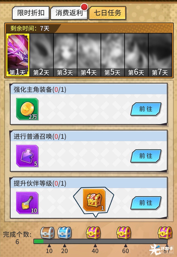 2. 七日任务:活动期间,完成七日任务,可以在页面领取各类养成资源、钻石、及玩法次数等丰厚奖励!全部完成可获得海量SSS伙伴碎片。