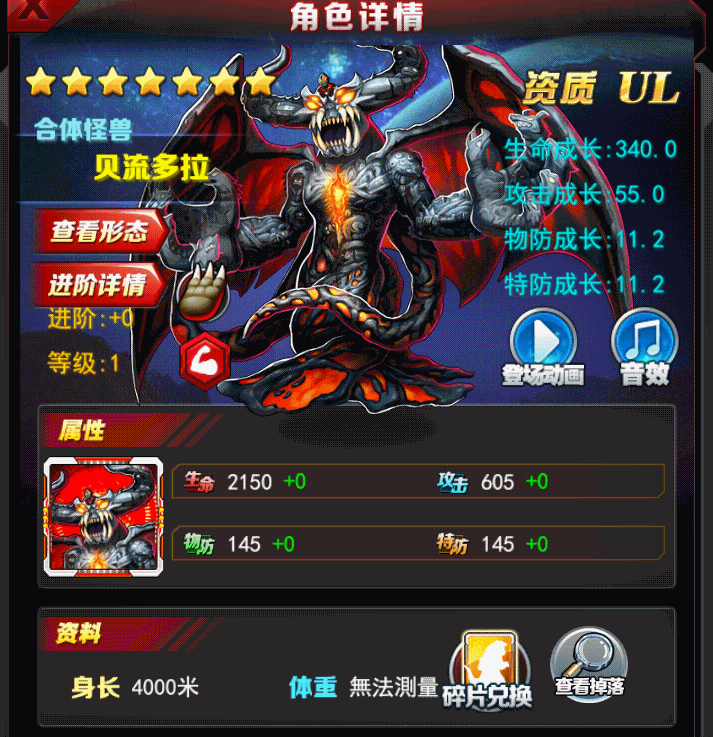 +12百兽统领 贝流多拉拥有<洗脑>效果。上阵出场时,使己方所有怪兽,宇宙人和机械角色