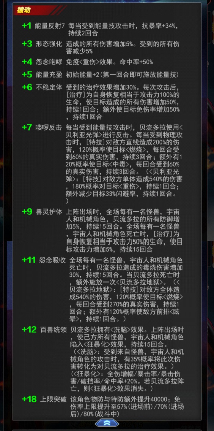 +9 兽灵护体上阵出场时,全场每有一名怪兽,宇宙人和机械角色,贝流多拉的所有防御增加5%,持续15回合。全场每有一名怪兽