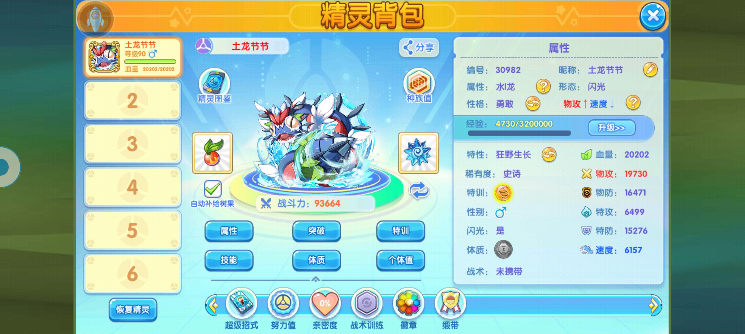 可想而知,这个精灵的坦度是有多么的高,当然了,我今天自己的强度就比较的一般了,可能是我今天第一次玩,不怎么会操作,所以才导致了今天各种被秒杀的情况出现,当然了也和我自己没有满突破满特训有关系,整体来说,土龙在现在这个环境能够,封神不仅仅是依靠着他的特性无限回血,还依靠着他的伤害,还有技能的多样性,因为这个精灵能够使用的技能实在是太多了,最变态的就是给了个致命狙击这个技能配合土龙的特性加伤,再结合后手必定暴击的效果连一般的水属性精灵根本防不住。可以说是打一下就怀孕,更不用说还可以利用盘卷接着强化,也弥补了致命狙击命中率不高的副作用。