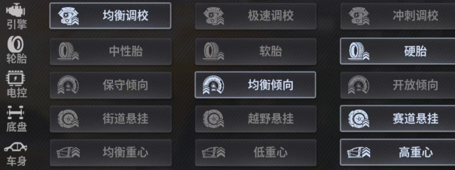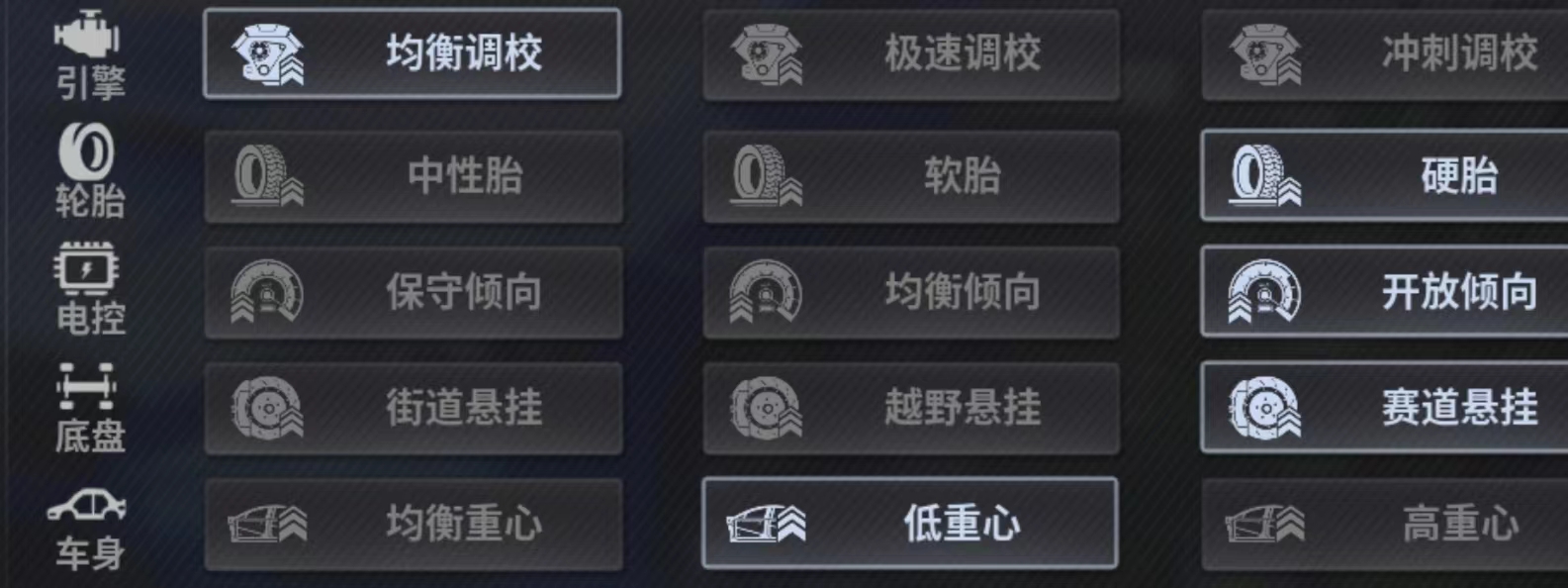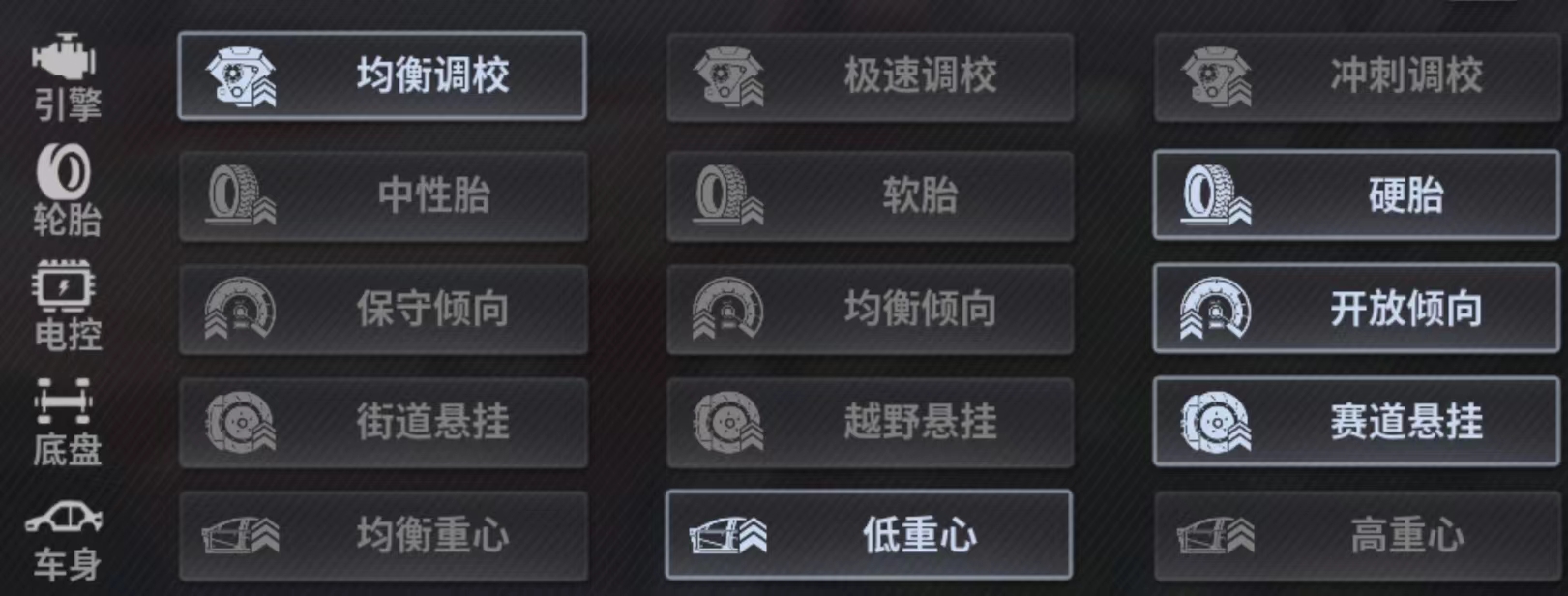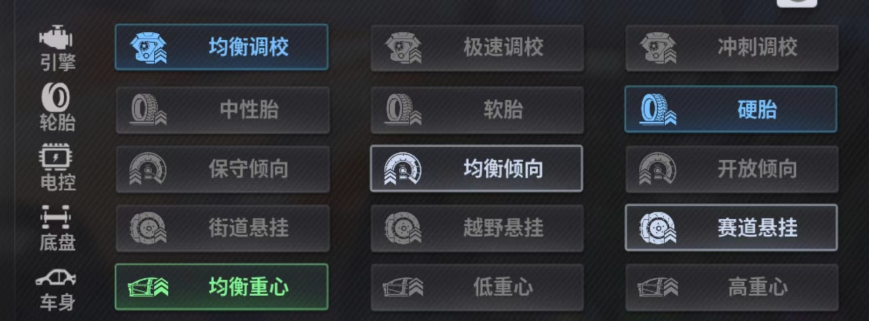 性能调校推荐:均衡 硬胎 均衡 赛道 均衡重心