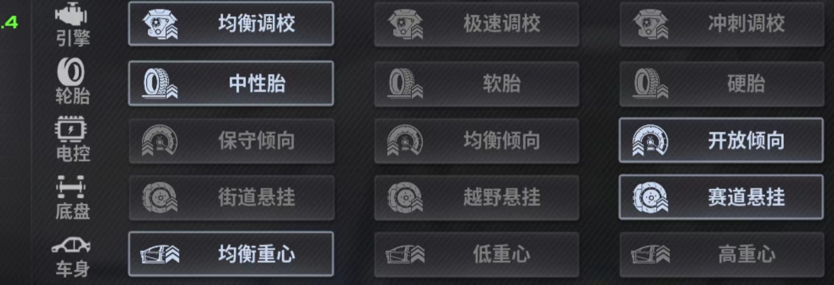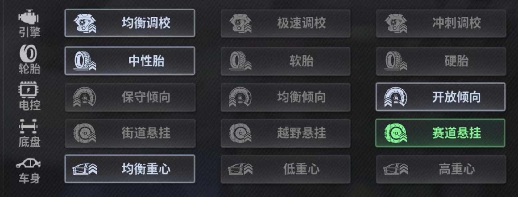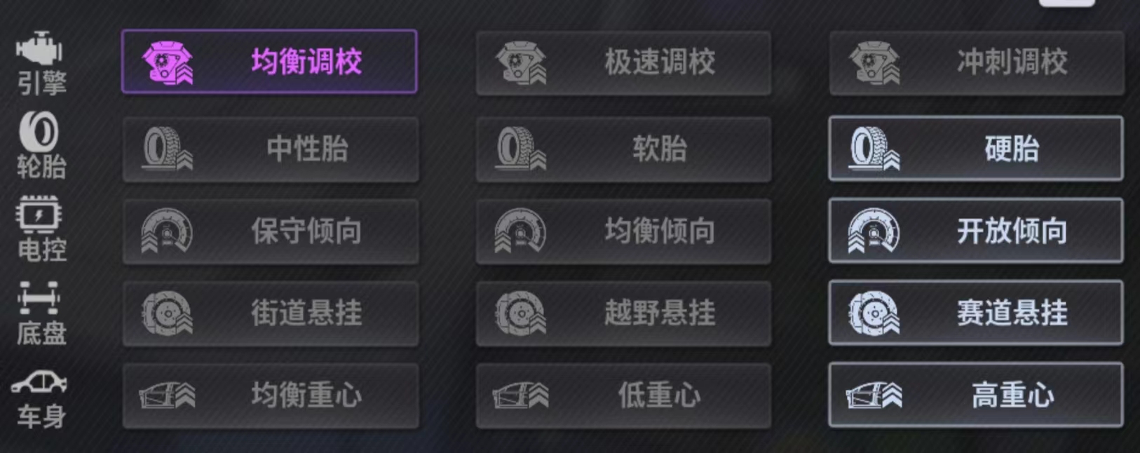 性能调校推荐:均衡 硬胎 均衡 赛道 均衡重心