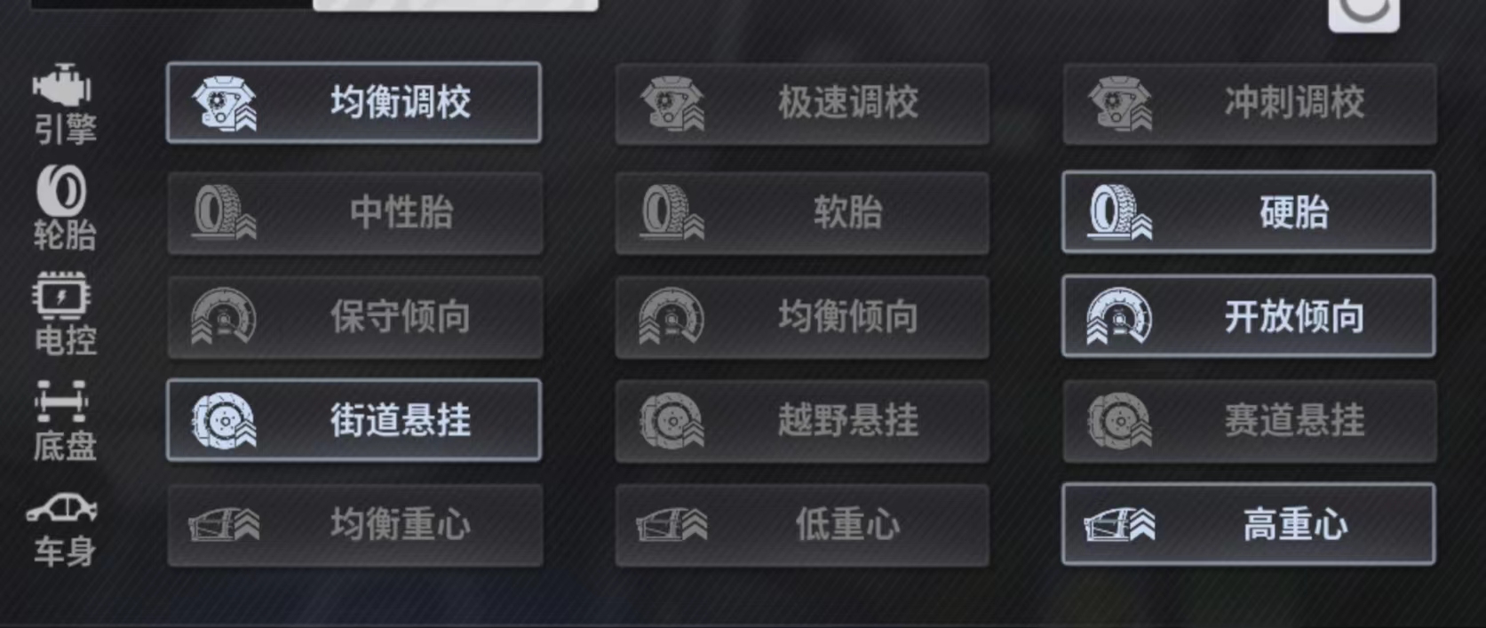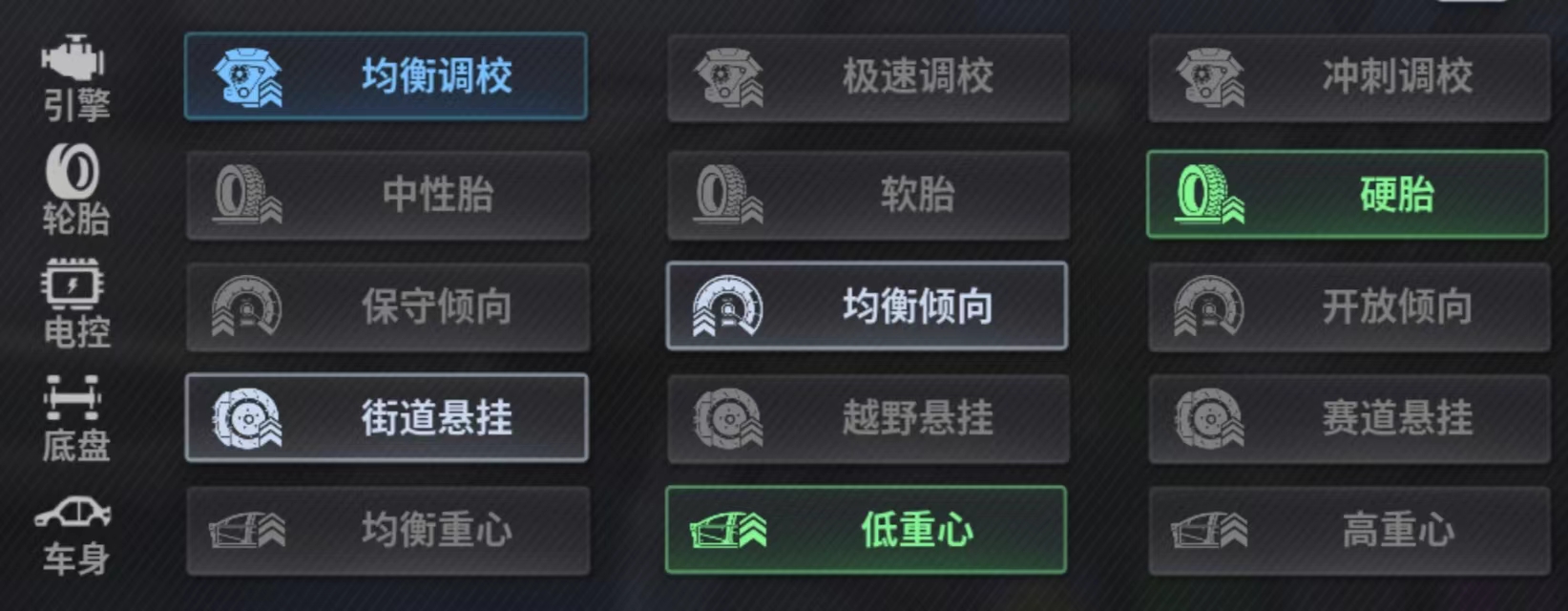 性能调校推荐:均衡 硬胎 均衡 街道 低重心