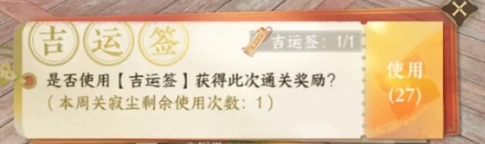 接下来是吉运签,需要通过团队获得单人模式后再去通关一次击杀boss后,使用吉运签就可以获得额外的奖励次数,但是这个只是给装备,不给内功,多余的吉运签可以留着后面打,剑梦凌缘3什么的也是可以的,剑梦凌缘2就不推荐打了,因为装备品阶太低。