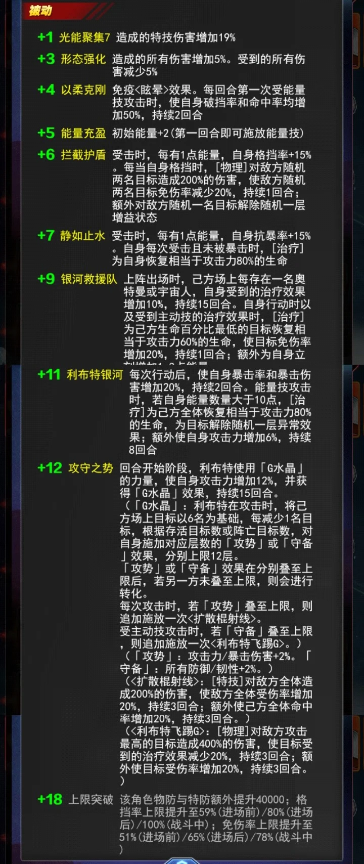 +11利布特银河 每次行动后,使自身暴击率和暴击伤害增加20%,持续2回合。能量技攻击