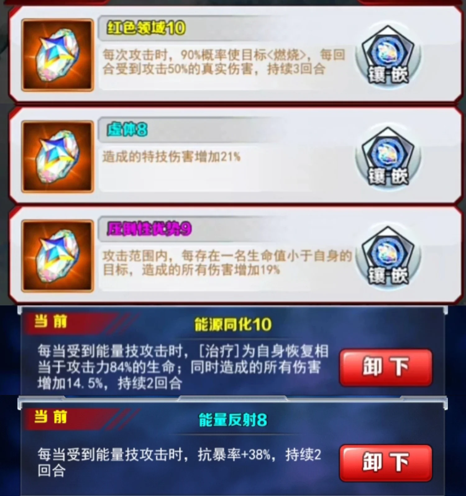 解析:有一点能量,自身抗爆率加15%,这个可以搭配生物的能量反射,提高抗爆能力,简单来说就是攻击敌人打你,没有暴击你就可以恢复生命,这样炮灰打你身上一般是不会触发暴击所以回血大概率是会触发的,从加67来看,这张卡是特别需要能量的一张卡,所以阵容方面就推荐用能量阵容