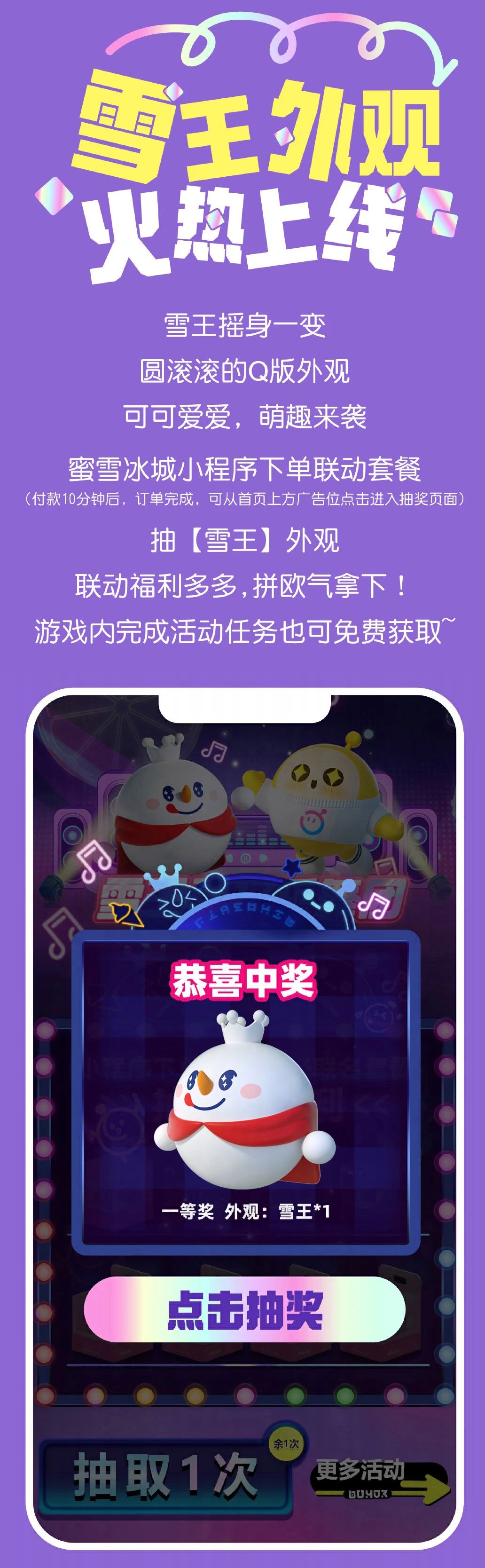 下单不仅可获限量联动贴纸或勋章还有机会抽取“雪王”外观