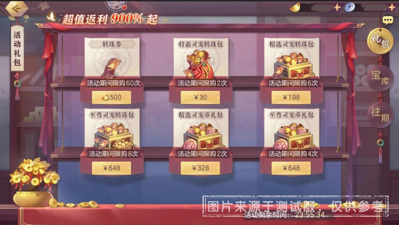 至尊灵宠转珠包:内含转珠券*45,元宝*6480,售价648元,活动期间限购8次。