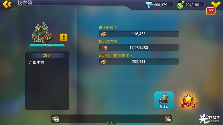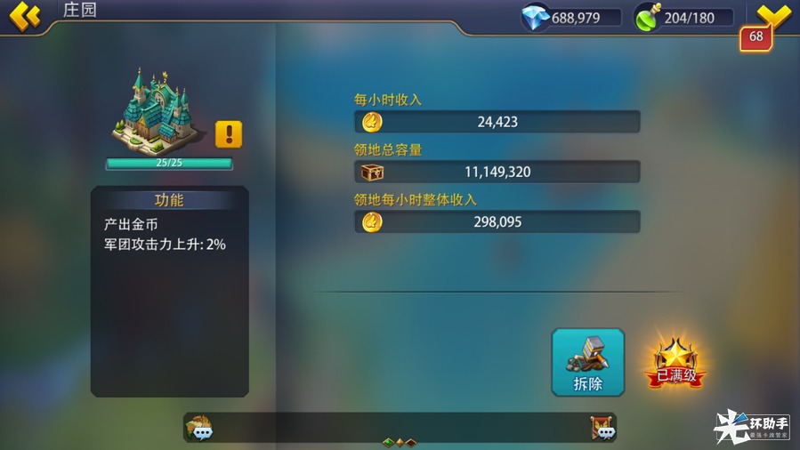 庄园可提升金币产量、提升领地金币容量、提升军营训练速度,初始即可建造,但是仅能建造于内城、沼泽、雪地、火山4种图块,最多可建造17个并与军营、医疗所共用最大建造数量。军营、医疗所、庄园可进行拆除。建造或升级庄园需要消耗普通资源与时间。