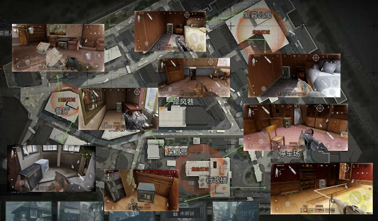 点位给大家,大家以后玩军港出生在附近可以先敌人一步抢到保险箱获取高价值物资。