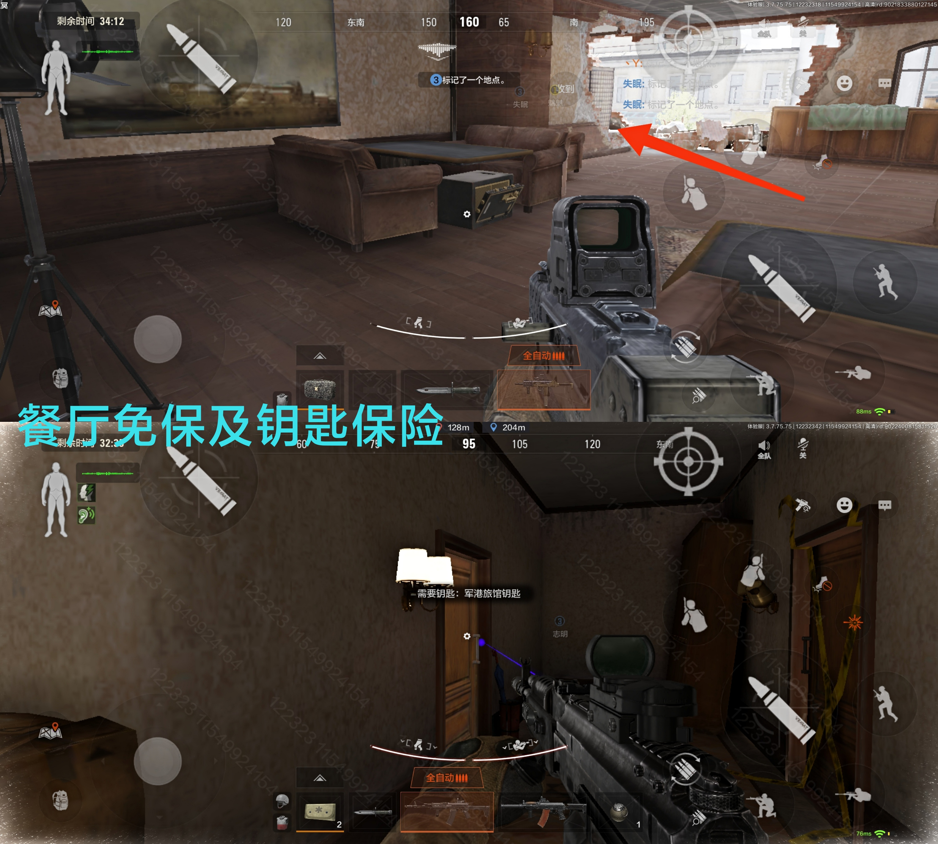 ①餐厅:二楼桌底免保以及跳跃过去另外一边有一个军旅钥匙房