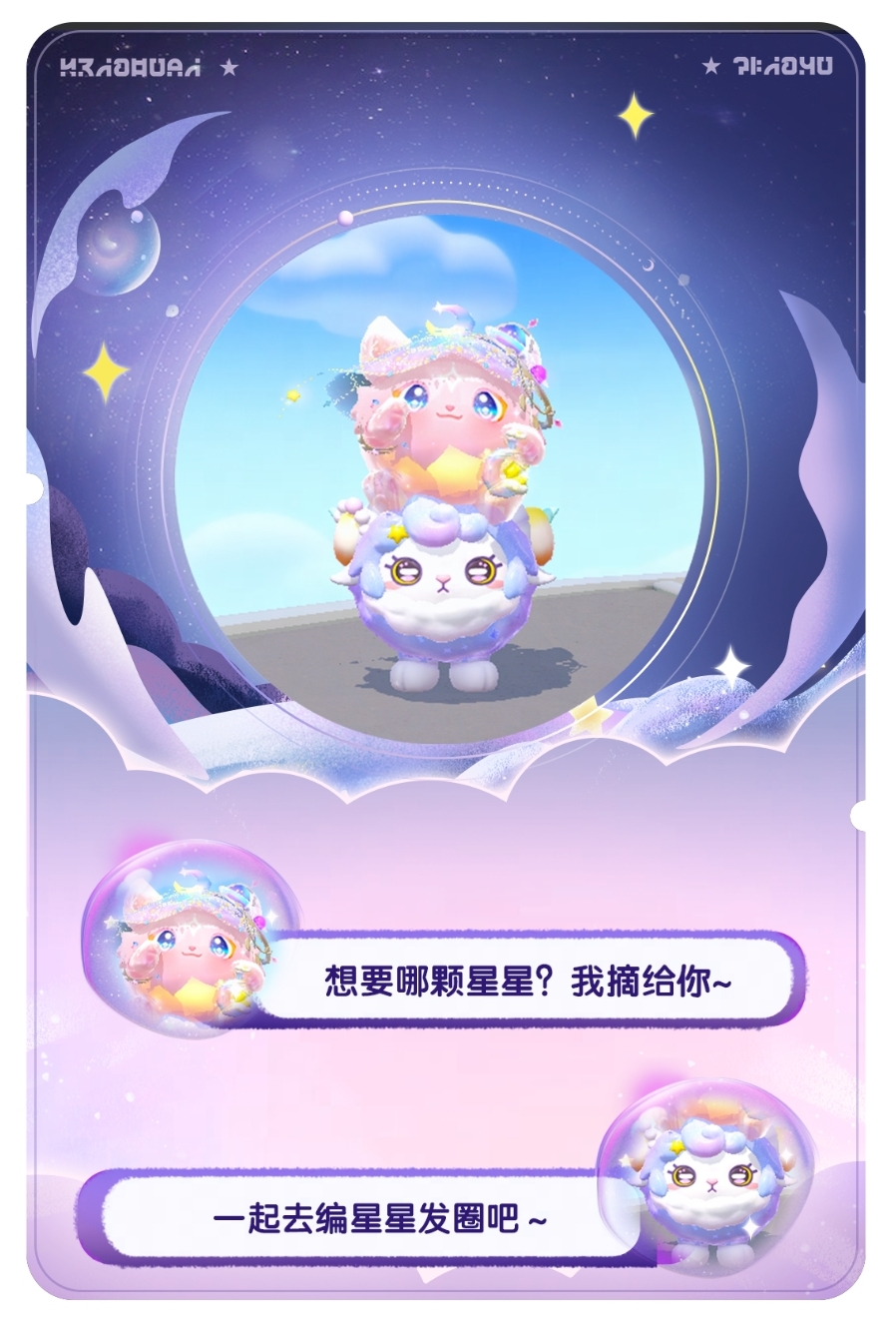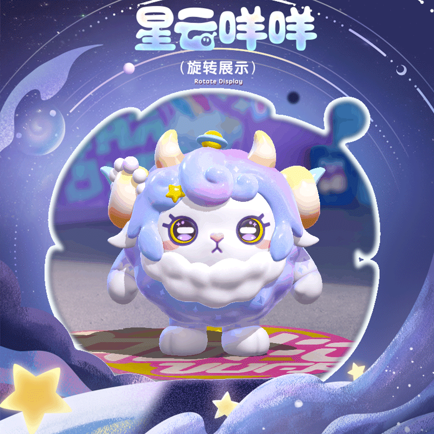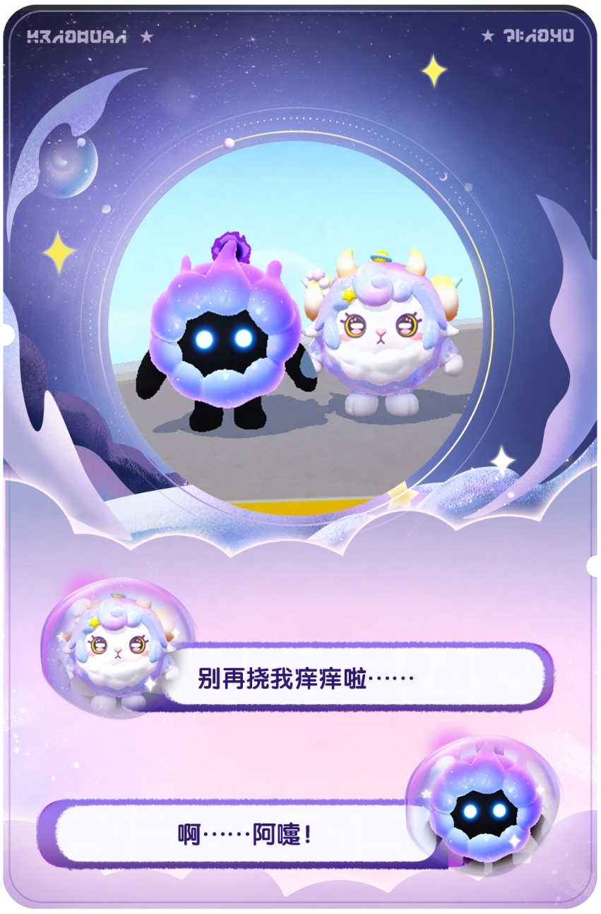 粉紫色的羊毛柔软美丽每一团都像是美丽的星云脖子一圈可是标志性“白围脖“虽然一直饱受毛量过多的困扰但咩咩也不放弃成为一只精致小羊彩虹色的羊角挂着星星发圈那是软软送给她的礼物自然卷刘海打理得一丝不苟但望着被毛毛淹没失去光彩的星球咩咩流露出迷茫的神情“我看着万千星河,不知应该去往何方。”