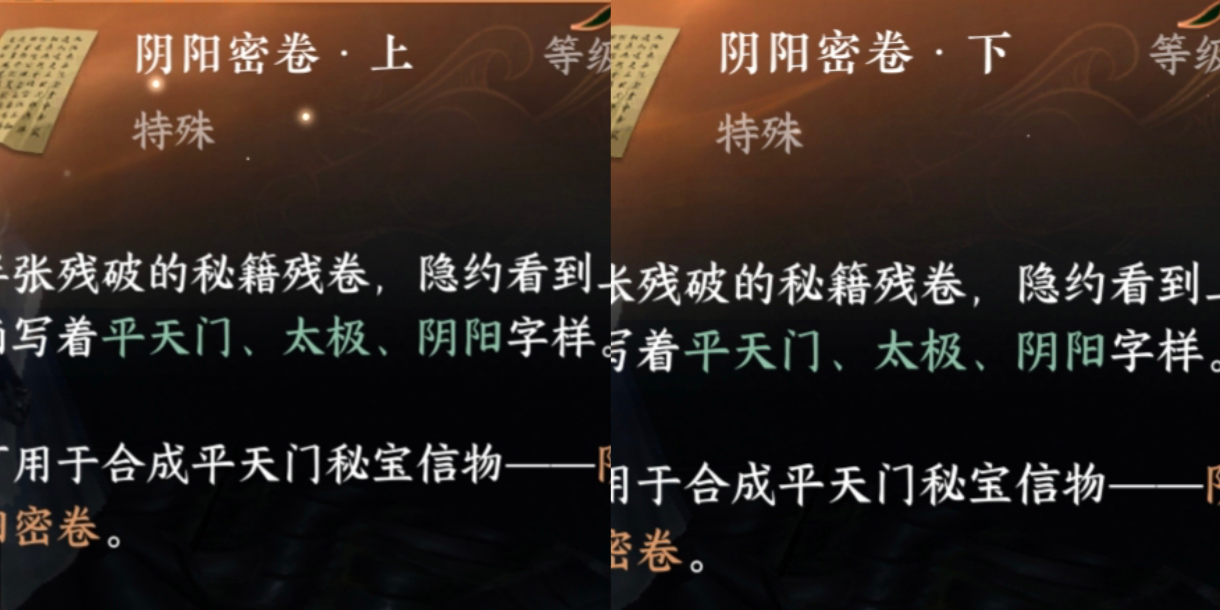 平天门的绝技信物叫【阴阳密卷】。需要找齐上卷和下卷才可以合成阴阳密卷。