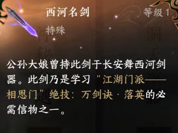 相思门的绝技信物名为【西河名剑】,个人觉得是最难的,所花费的时间也是最长的。