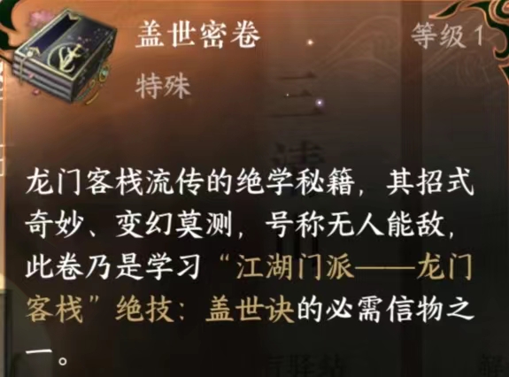 龙门客栈的绝技信物是【盖世密卷】。获得方法也是非常简单的。解锁6个地图的所有驿站就可以获得了。