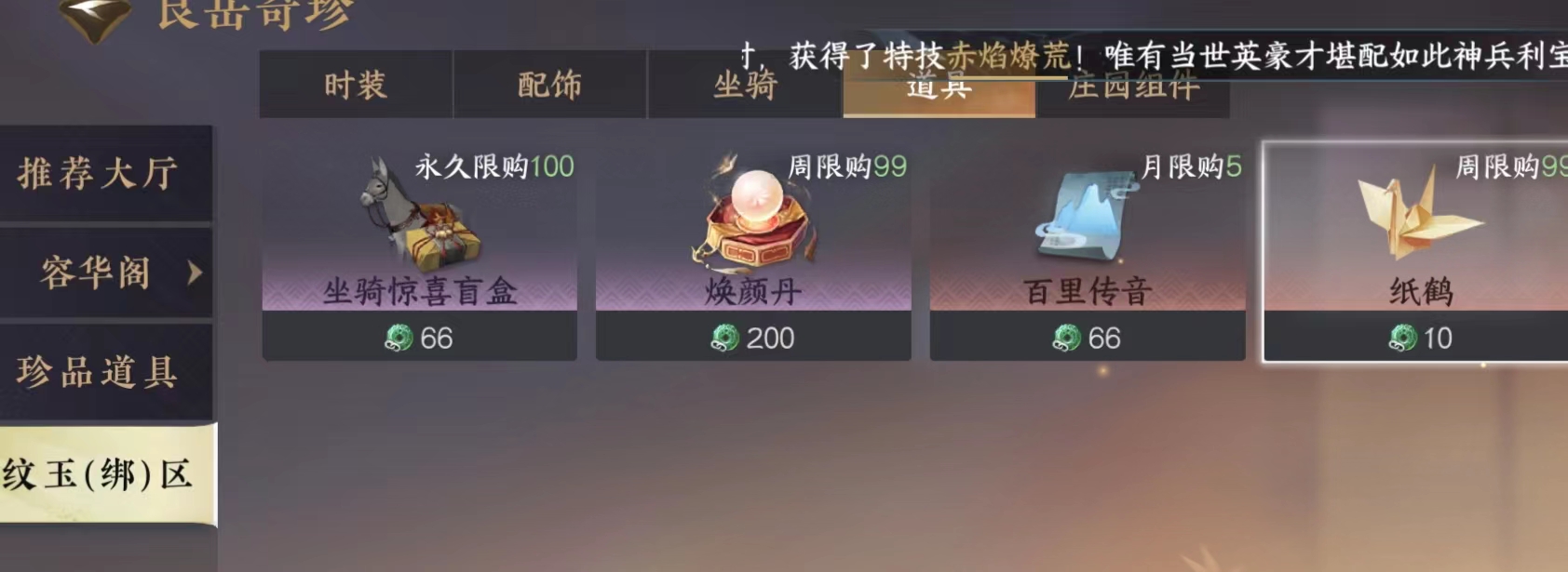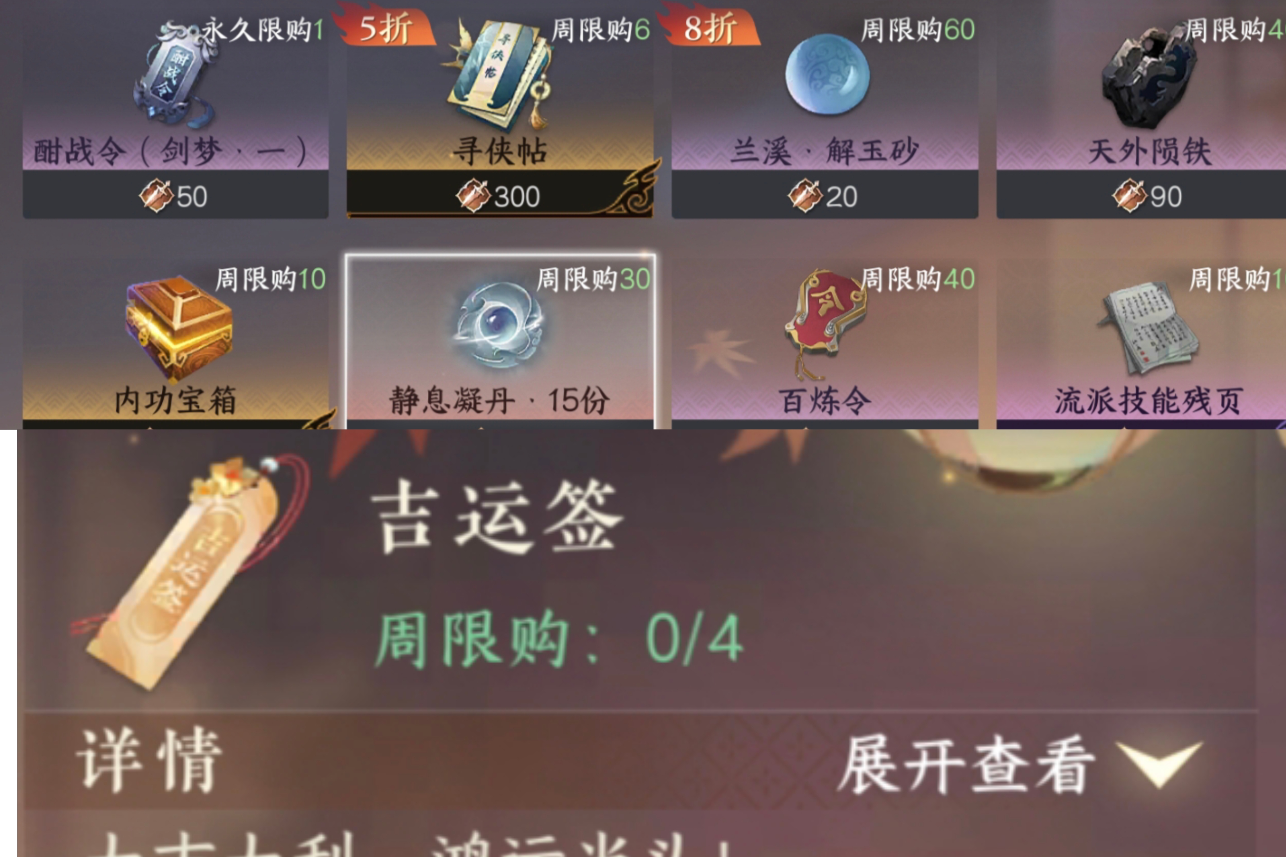 酣战令 5折寻侠贴 解玉砂 天外陨铁 内功宝箱 静息凝丹 百炼令 流派技能残卷 +吉运签。