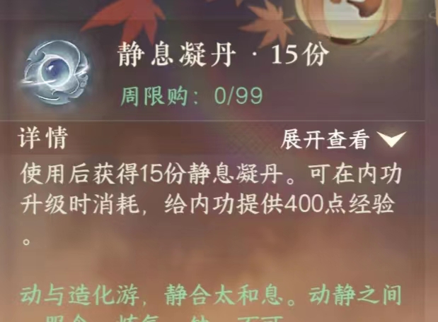 【静息凝丹】每周必须兑换,可以帮助提升我们功法。