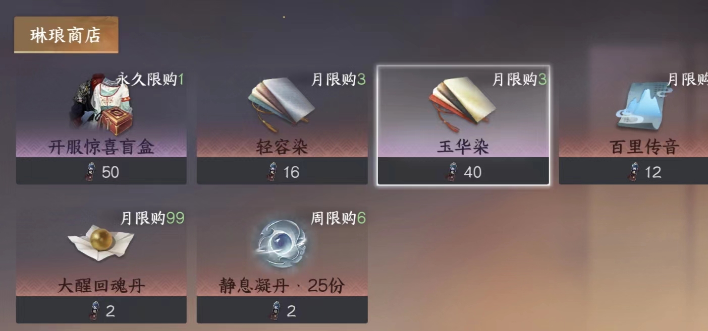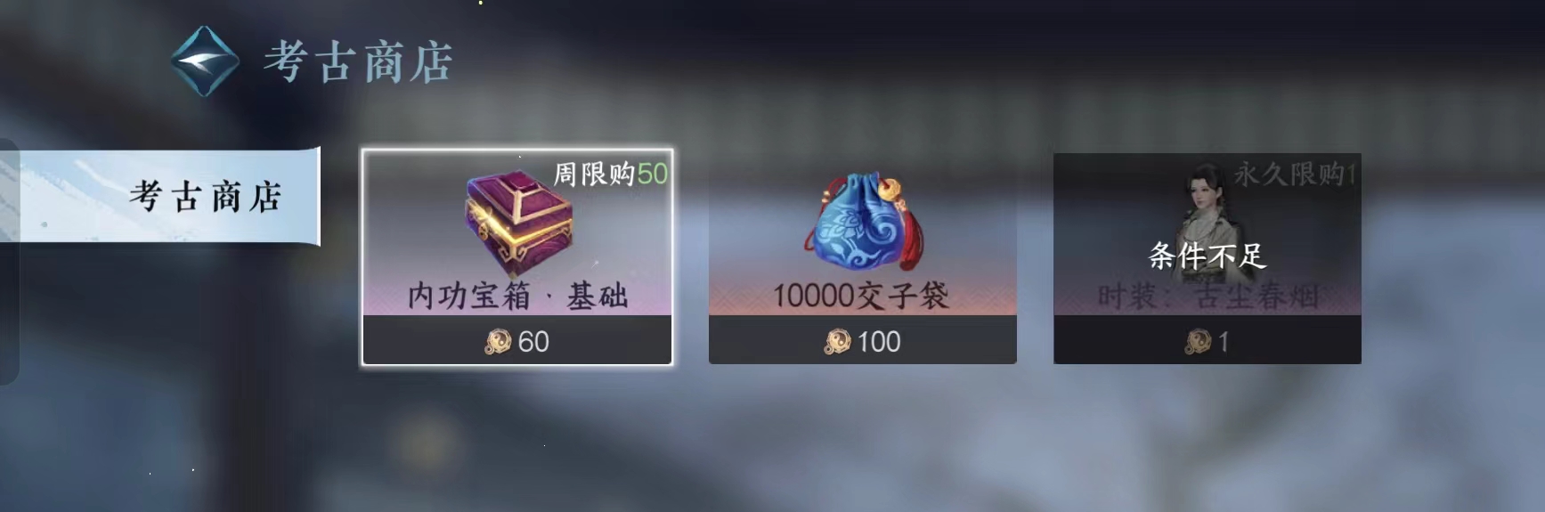 其他剩下的都可以兑换。解玉砂+天外陨铁是强化和打造装备的核心资源,内功宝箱可以获得金色的内功,培养内功胚子和好内功很重要,静息凝丹是给内功升级用的,也是非常重要的资源。吉运签是每周必买的,可以在增加副本boss的奖励。百炼令是在装备里兑换百炼装备的重要道具。