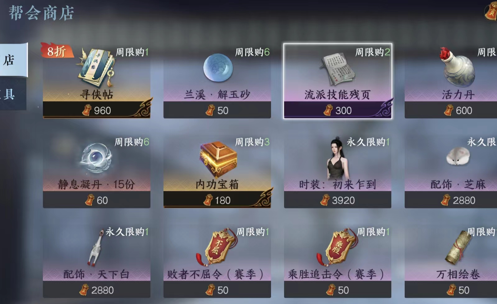 ①:帮会商店优先推荐兑换 【静息凝丹】【内功宝箱】【流派技能残页】这3个。
