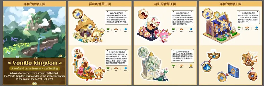 香草王国以它的尖顶塔楼和装饰华丽的礼堂大厅闻名,墙壁是华夫饼干和白巧克力,奶油白+蓝的配色也是香草王国的标志。纯香草饼干胸前四叶草形状的宝石徽章,可以在香草王国的各种建筑上见到哦,比如香草诊疗所、王国的旗帜等等~