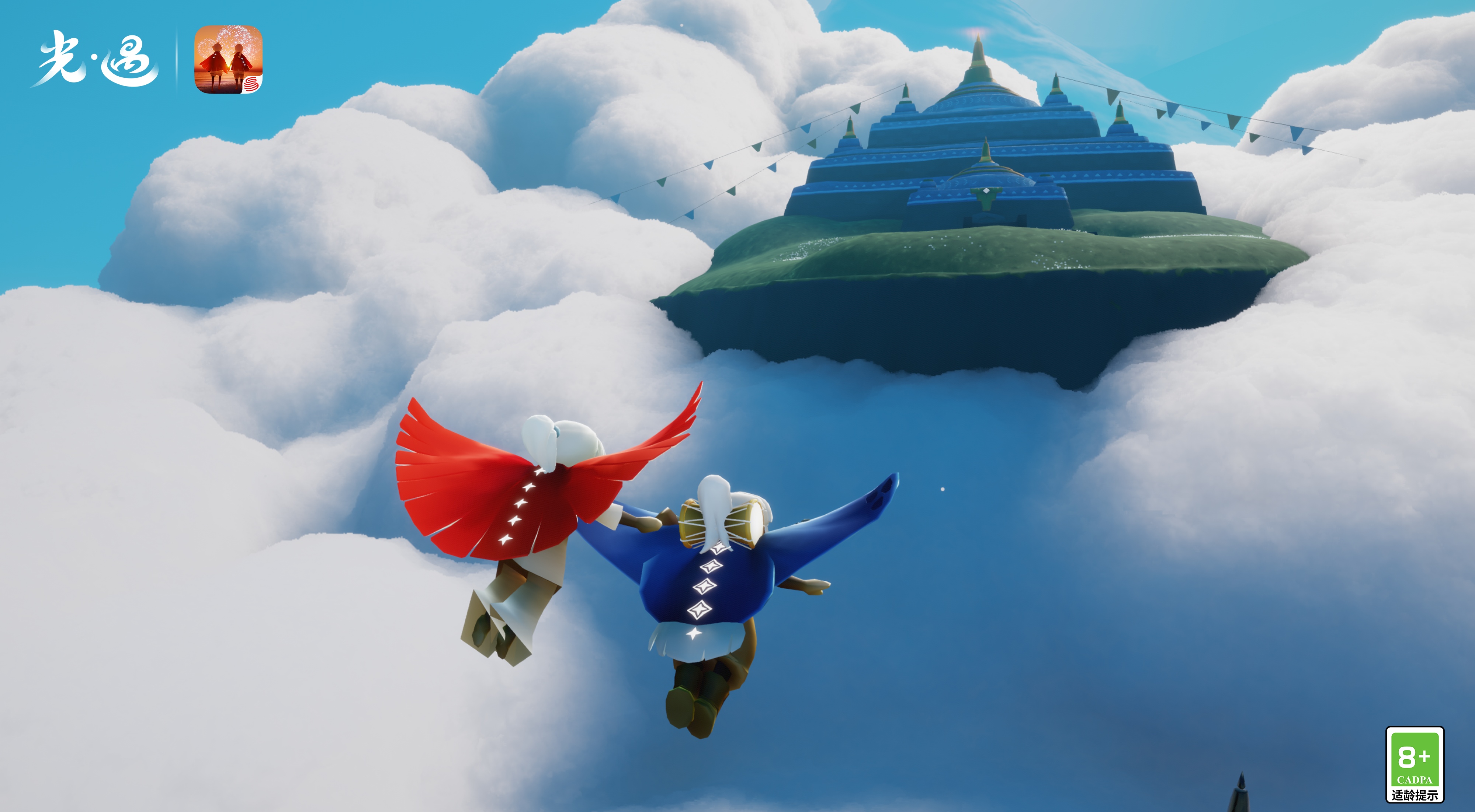 从那之后,我和小芮的联系愈发密切了起来。我们总是一起跑图、一起看风景,将天空王国的每个角落都填满五颜六色的回忆。小芮最爱的是与霞谷先祖换来的红色斗篷,每当我们牵手翱翔在晴朗的天空下,展开的斗篷就像是开出了一朵鲜艳的花,在洁白的云层中格外灿烂。