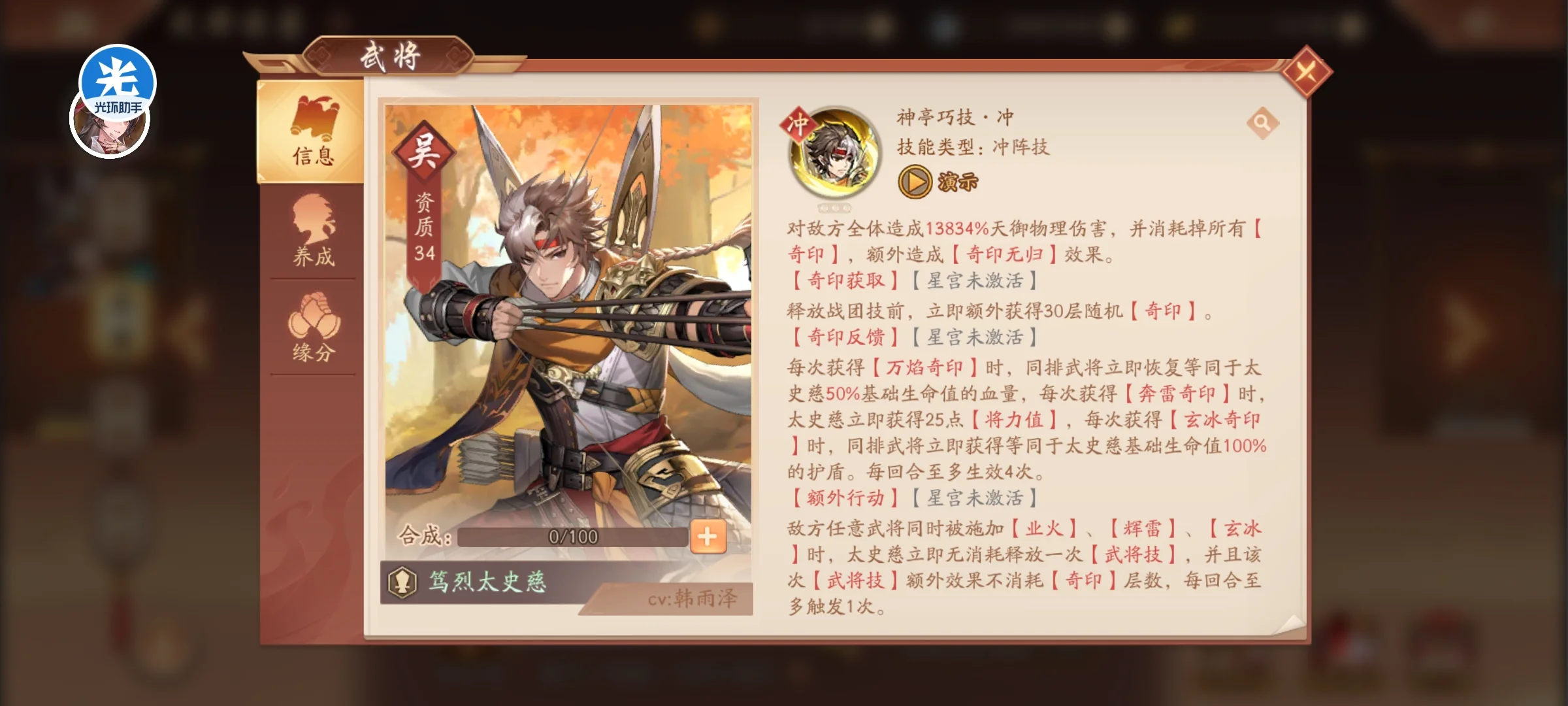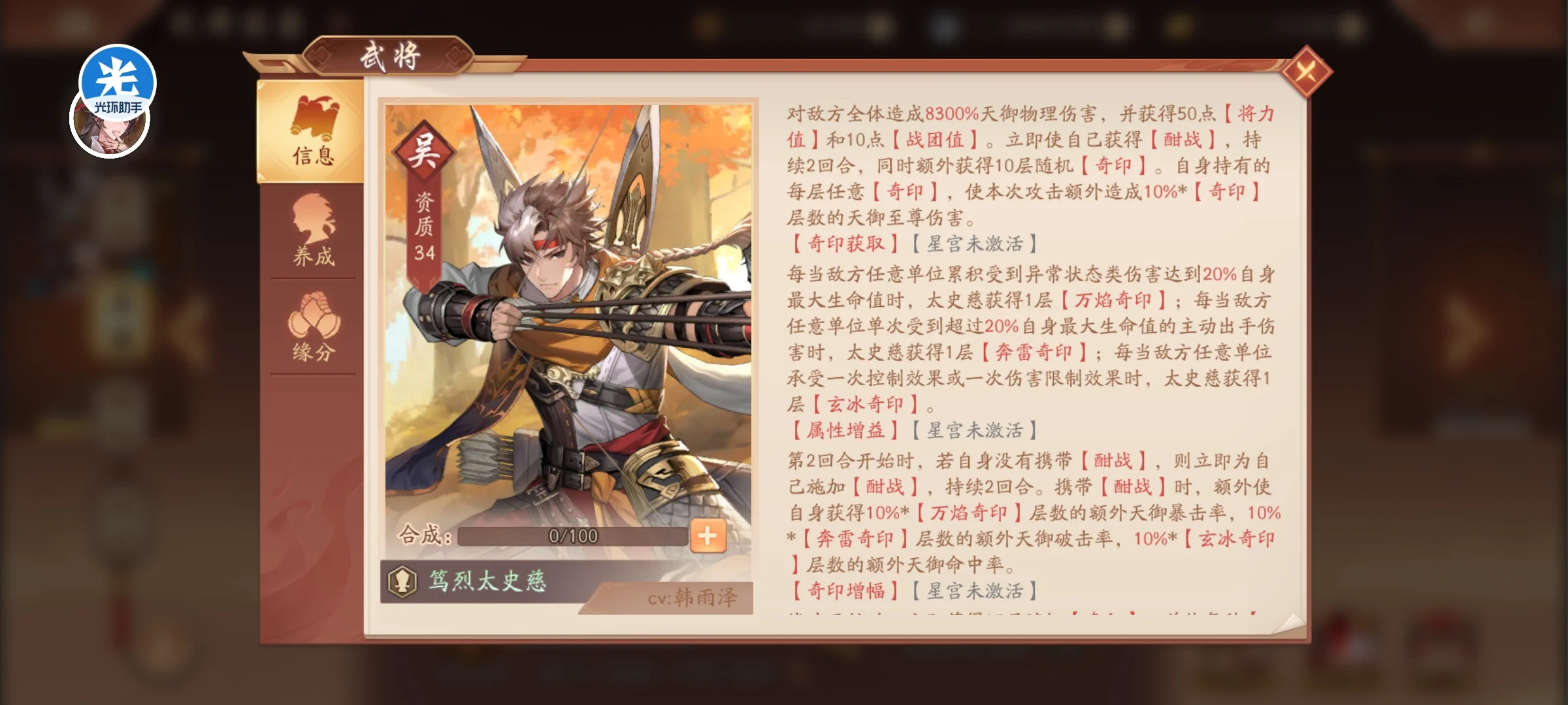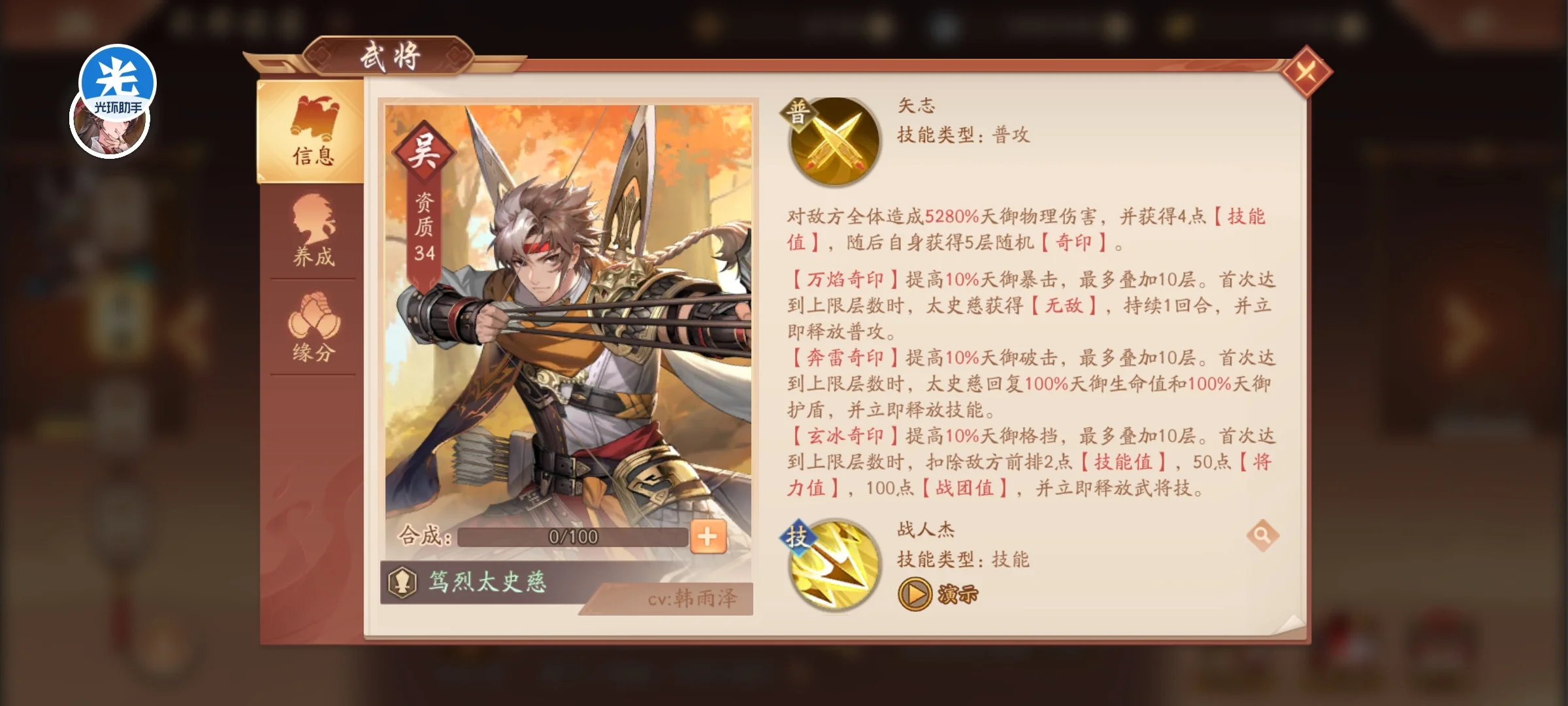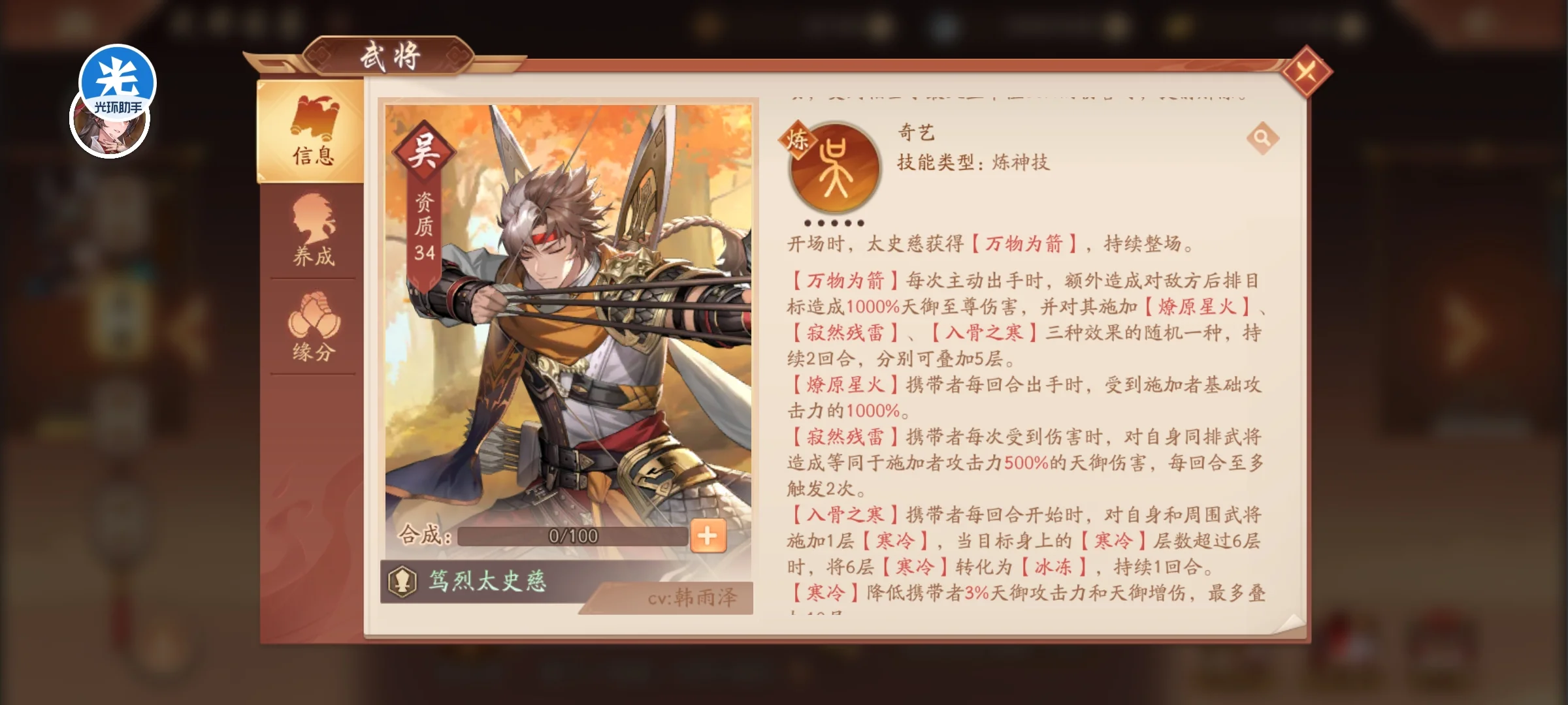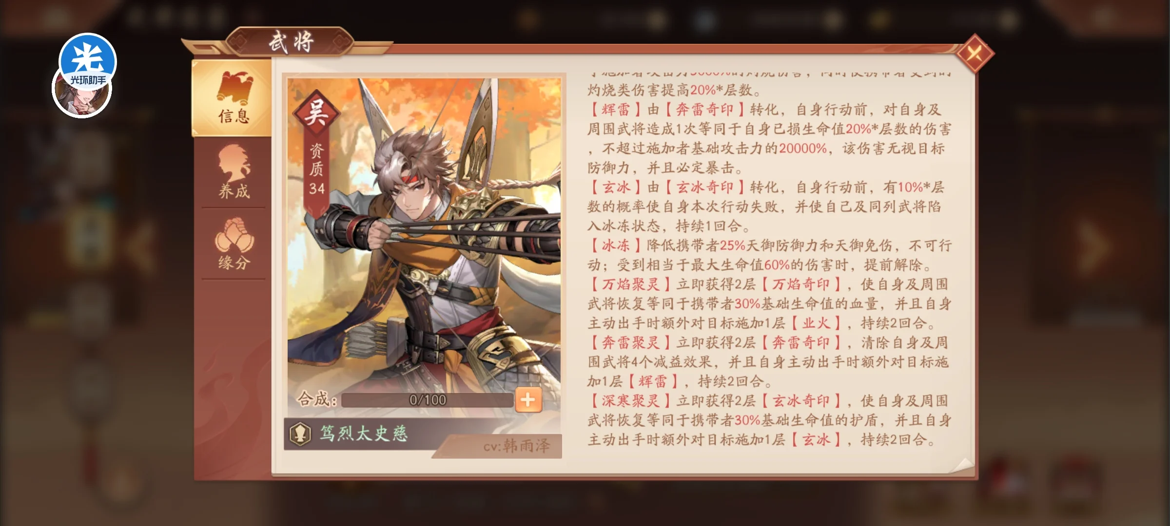 大家好,我是天池太子。现在说到了吴国笃烈太史慈。字数多到不想看,靠三种叠印,把冰火雷元素的效果拼凑在一起。