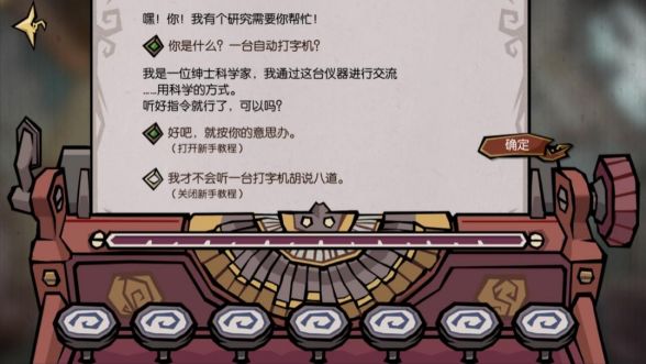 造型选定之后会播放第二段CG,一位“绅士科学家”会通过打字机与冒险家取得联系。通过打字机的对话选项决定是否开启详细新手教程,冒险家可以根据对饥荒游戏的熟悉程度自行选择。最后输入并确认角色名字,一股能量漩涡便会将冒险家吸入永恒领域。