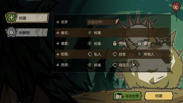 在点击家园之门后打开的沙盒世界界面中,我们可以创建一个全新存档,也可以通过寻找世界进入好友或者其他陌生冒险家的存档进行联机游戏。