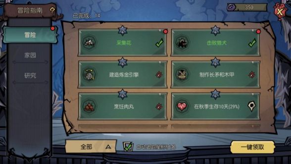 1. 一星任务:包括度过黑夜、沙盒秋季生存3天、制造科学机器等6个任务,难度都不大,需要冒险家制作好火炬、斧头、鹤嘴锄等道具,制造科学机器则需要找到1个金块。除了正常的跑图解锁地图迷雾以外,可以找到各种生物的聚落,在它们附近采集资源,然后到黑夜时借助聚落中的路灯和篝火照明更为轻松地度过夜晚
