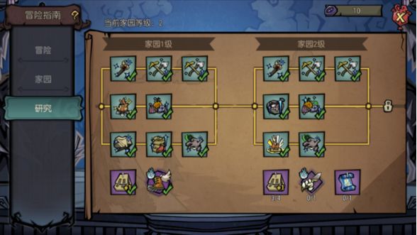 通过完成冒险任务可以获得道具奖励与用于研究科技树的冒险徽章。每个家园等级都会解锁一系列新科技,通常按照科技树等级逐个点亮即可,但每级科技树还有一些特殊奖励,包括附加背包、新特质和新配方等,就需要好好地筛选一下,按需获取。