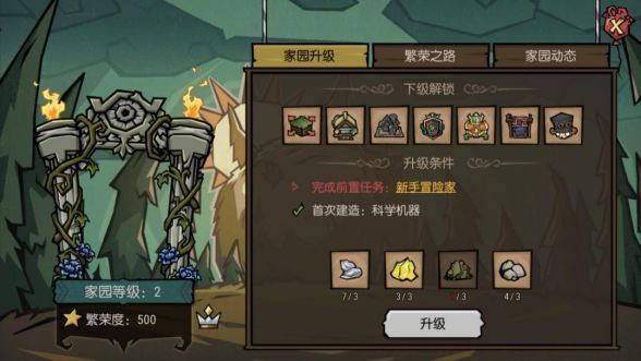 首先,家园升级需要完成前置的主线和建造任务,其中主线任务对应冒险指南的星标任务,跟着任务要求去做即可;其次还需要消耗部分材料,可以在探索世界的过程中注意收集,提前准备起来。