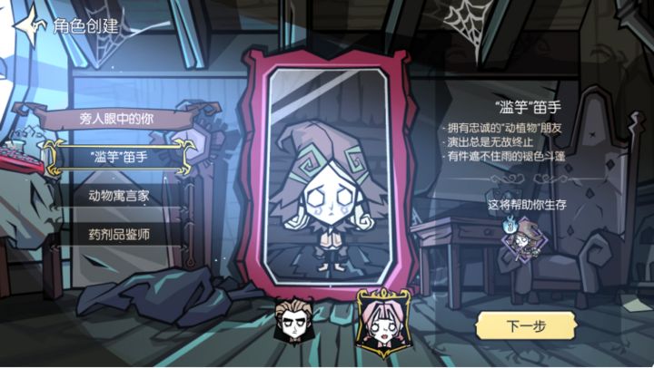 观看CG动画后进入角色及性别选择环节,当前《饥荒:新家园》中共设有三种职业并拥有不同的初始特质,分别是:笛手(召唤鼠帮手)、动物寓言家(清空周边怪物仇恨)以及药剂品鉴师(制作多种功能性药水)。三种职业的特质和外型各有特色,但初始三维(生命/饥饿/理智)均一致为140,没有一定的强弱之分,进入游戏后特质和外型还可以重新调整搭配,因此冒险家根据自身的游戏习惯选择喜欢的职业即可。