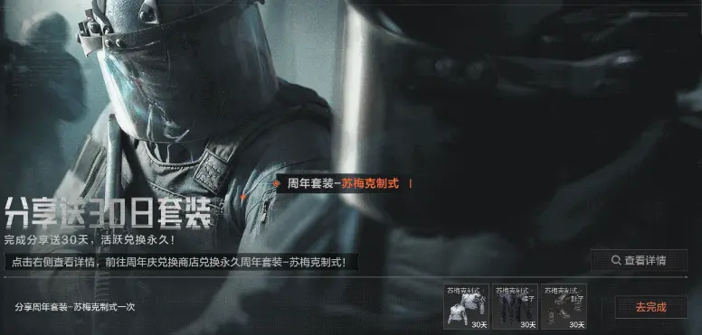 限定套装简单获得!活动期间,先锋们需要在指定活动页分享任务,即可领取服装【苏梅克制式安保服 套装(30天)】。