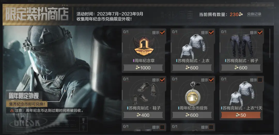限定装扮商店开放期间,通过使用纪念币即可兑换永久周年庆限定外观,还能兑换【纪念币枪械挂件】、【周年纪念章】等限定物品!