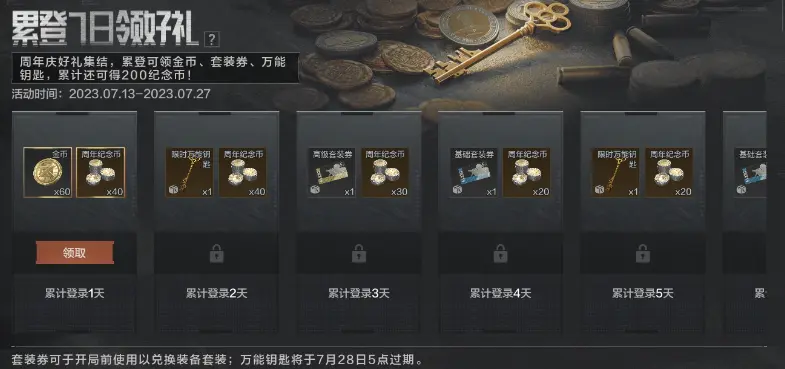 只要累计登录暗区满7天,期间即可领取【金币】、【套装券】、【万能钥匙】、【周年纪念币】等丰厚好礼!
