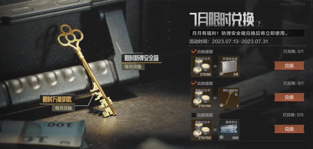 周年庆福利怎么能少得了安全箱体验卡和万能钥匙呢?先锋们的纪念币除了兑换限定外观外,在7月期间还可通过纪念币兑换【2X2安全箱(3天)】、【限时万能钥匙】、【赛季积分】等好礼~