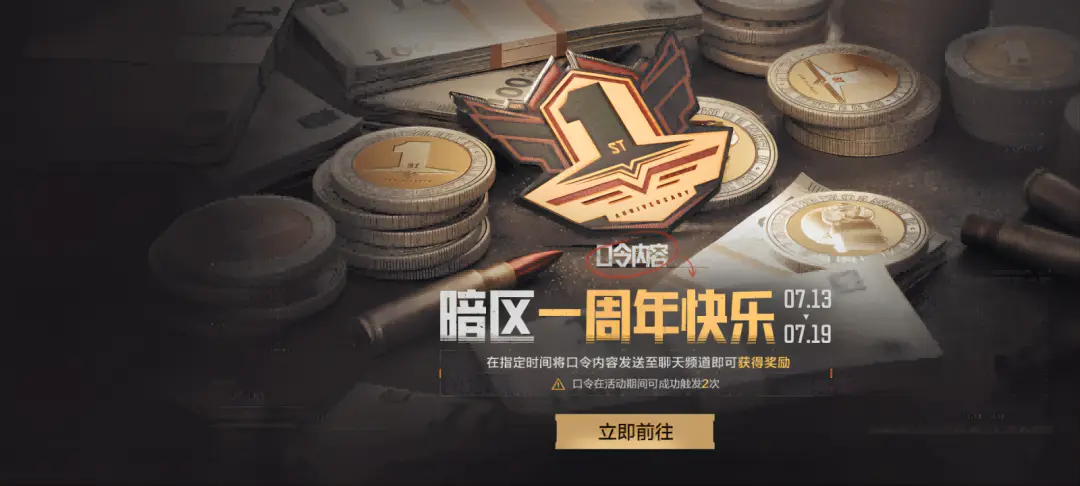 活动期间在世界聊天频道输入并发送指定口令内容【暗区一周年快乐】,为暗区周年庆发出庆祝,即可获得口令红包!